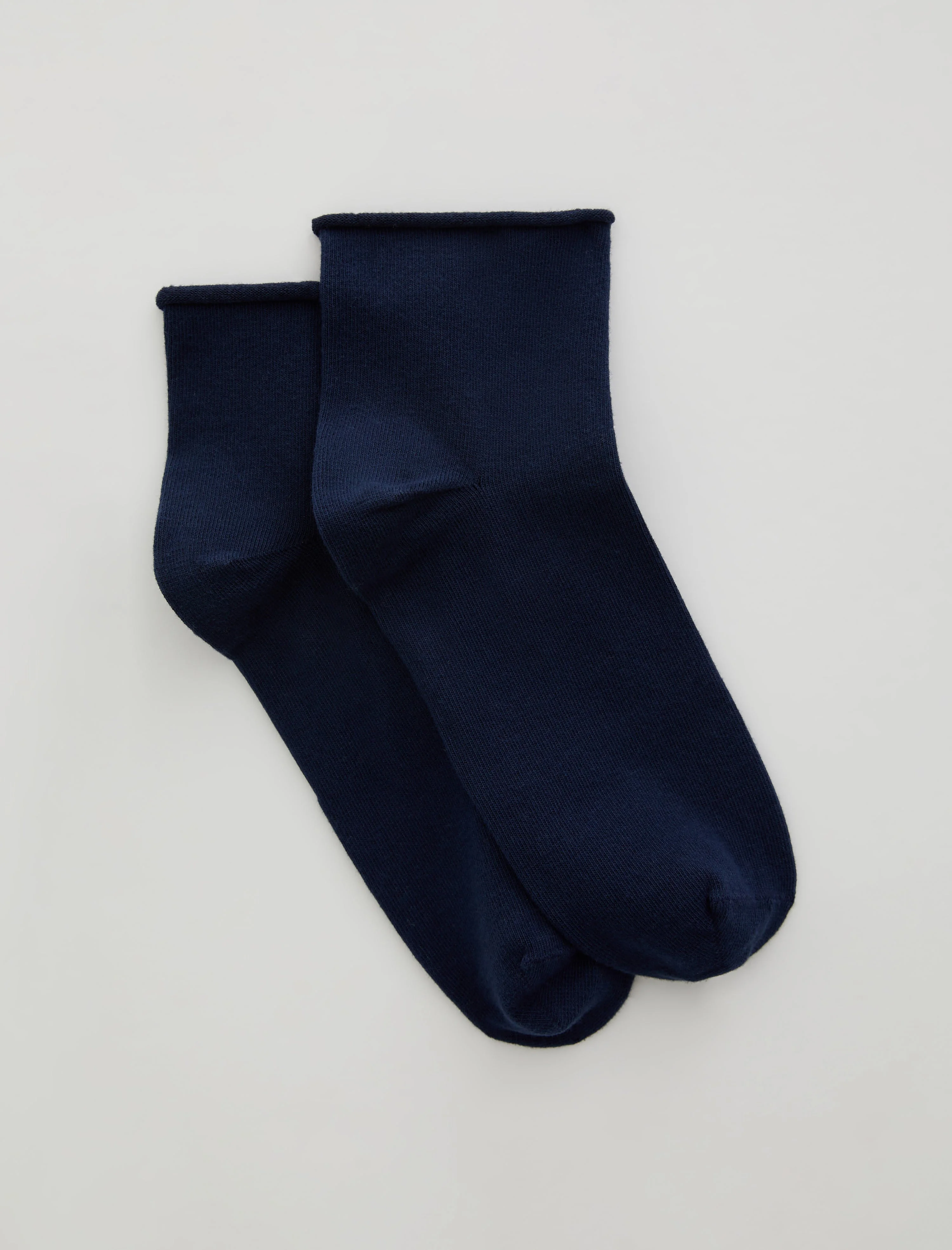 Unisex This sock is our classic shorty sock. Featuring a a solid navy color, this pair has been knitted from a comfortable cotton blend and rolled at the ankles. DETAILS & FIT - Small: W 4" - 6" - Medium: W 6" - 10" / M 6" - 8" - Large: W 10" - 13" / M 8" - 12" FABRIC & CARE Fine Cotton Yarn, 48% Nylon, 38% Cotton, 14% Elastane