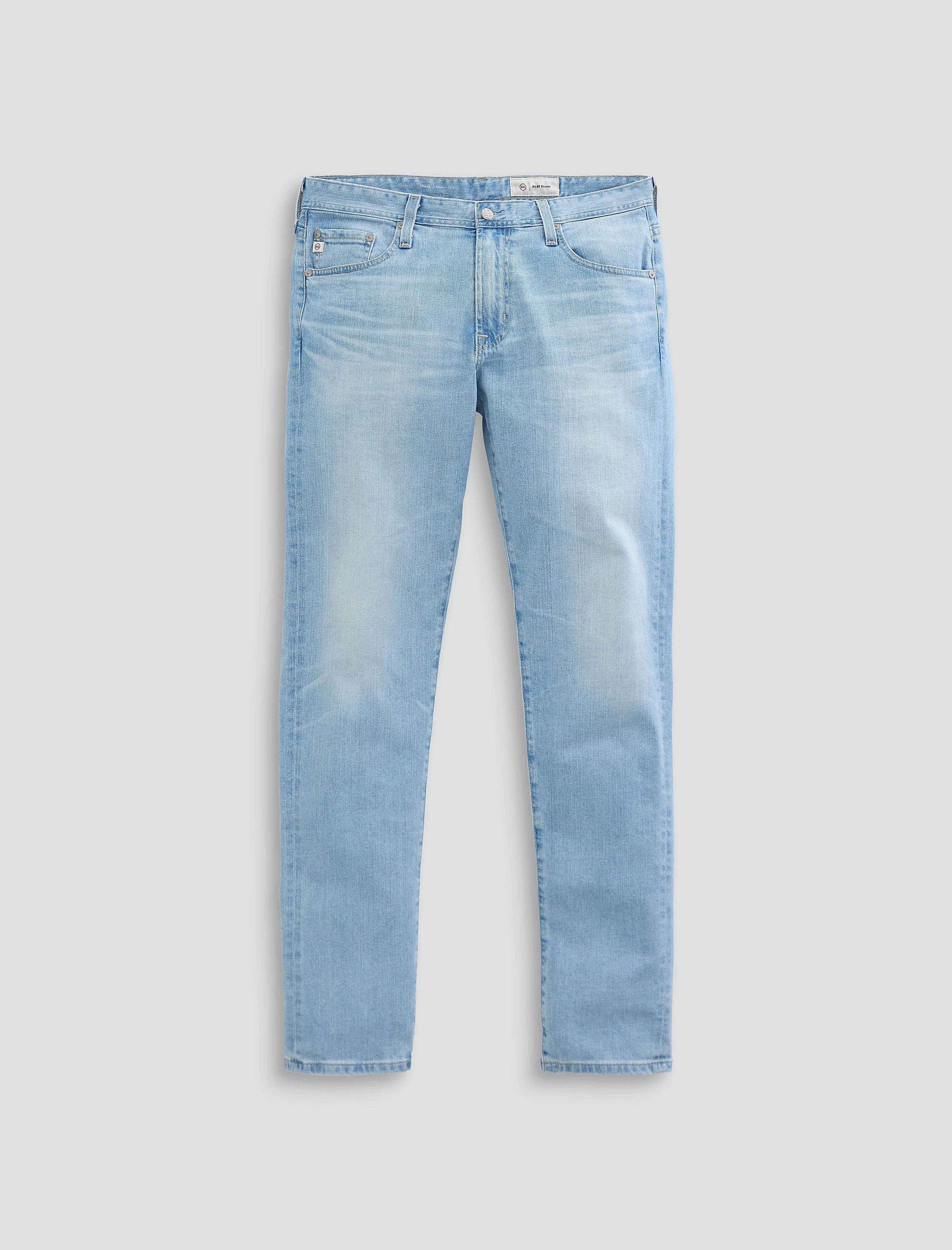 Modern Slim A light AG-ed™ wash meant to resemble 23 years of authentic wear, the Tellis is a modern slim jean with a mid-rise waist and a tapered leg. Made from 9.75 oz. Japanese Mid-Weight Indigo Stretch Denim, this five-pocket style comes in a light blue wash and offers everyday comfort with a clean, streamlined fit. DETAILS & FIT Model is wearing size 32. - Front Rise: 10" - Knee Opening: 16 1/2" - Bottom Opening: 14" - Inseam: 34" FABRIC & CARE Mid-Weight Indigo Stretch Denim, 9.75 Oz. 98% Cotton, 2% Polyurethane
