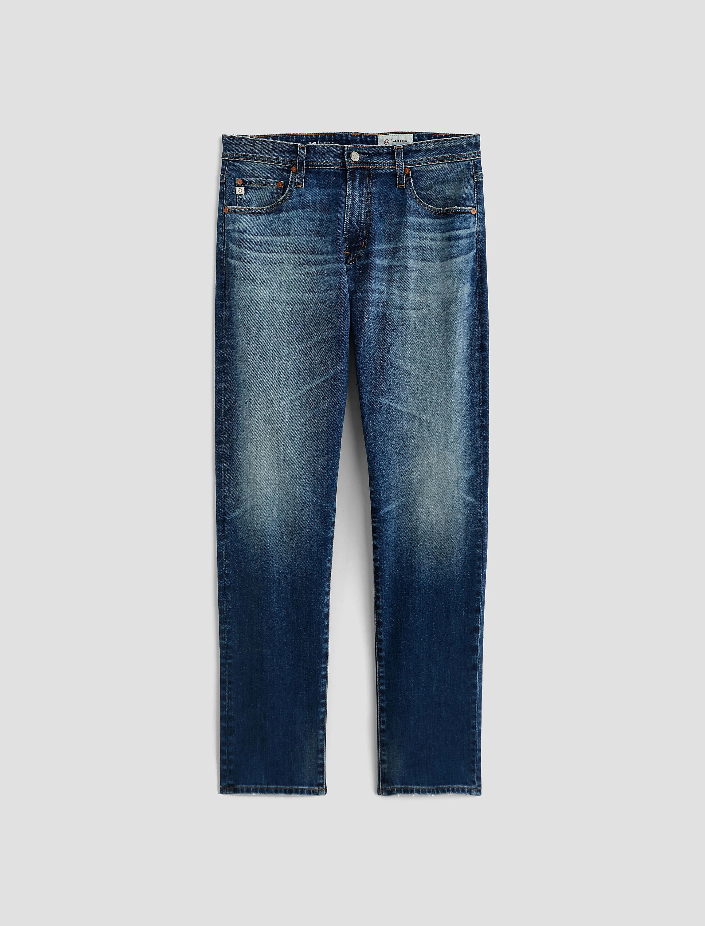 Modern Slim The Tellis is a mid-rise slim jean made from 11.5 oz. Japanese Masaaki Comfort Stretch Denim. Designed with a fitted upper block, the style features slim legs that taper down to the ankle. This five-pocket jean comes in a medium AG-ed™ wash that replicates 10 years of wear with subtle fading and offers everyday comfort with a flexible fit. DETAILS & FIT Model is wearing size 32. - Front Rise: 10" - Knee Opening: 16 1/2" - Bottom Opening: 14" - Inseam: 34" FABRIC & CARE Masaaki Comfort Stretch Denim, 11.5 Oz. 98% Cotton, 2% Elastane