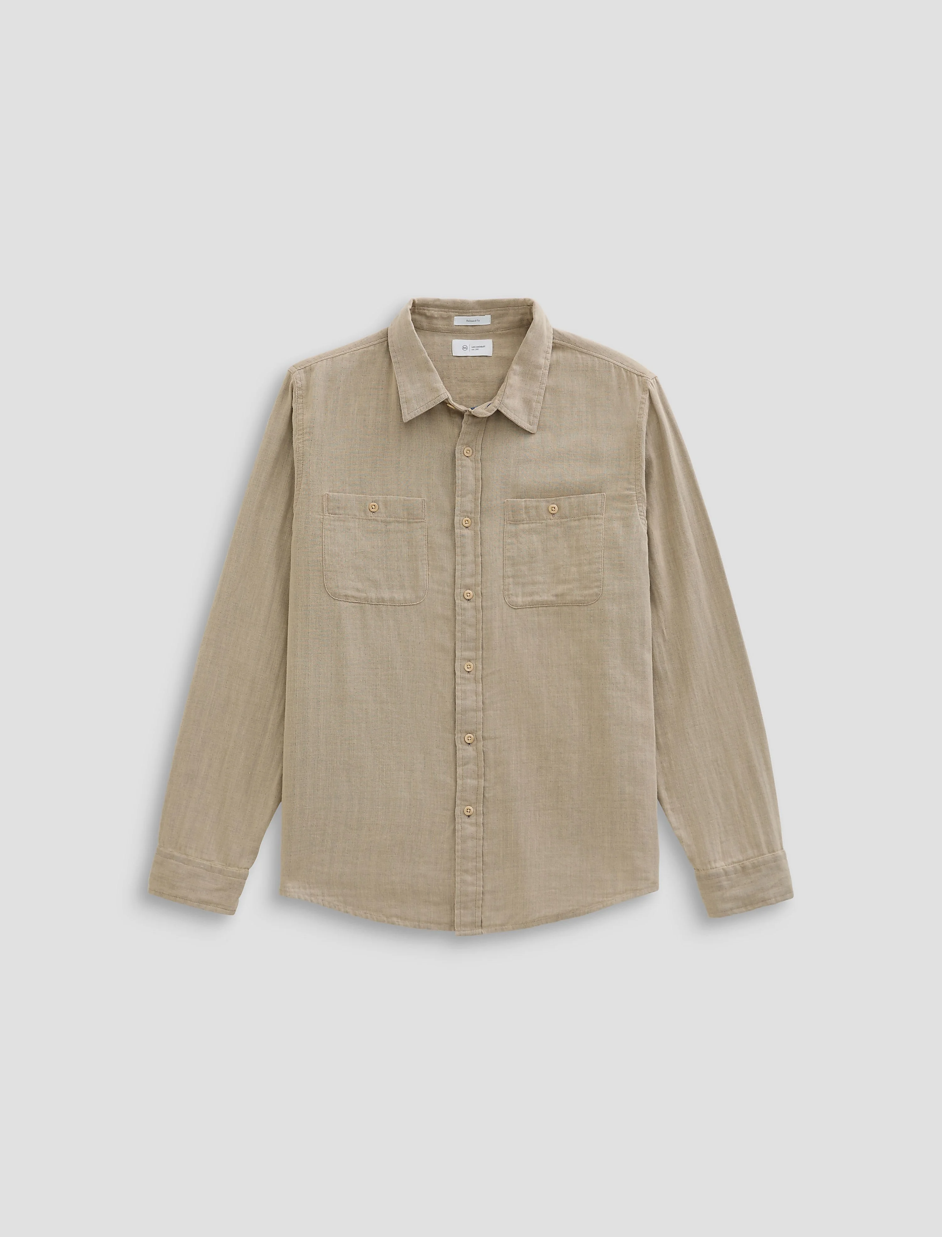 Utility Button Down Wayne is a work shirt crafted from our 100% cotton Stone Stripe Double Face Gauze, our lightweight, breathable fabric with a lived-in feel. Relaxed fit, curved hem, buttoned chest patch pockets. Designed in a neutral beige color, Khaki Sand, with blue striped sleeve lining for the style option of a high-contrast cuffed look. DETAILS & FIT Model is wearing size M. - Body Length: 29 1/2" - Chest : 46 1/2" - Sleeve Length: 26" FABRIC & CARE Stone Stripe Double Face Gauze, 100% Cotton