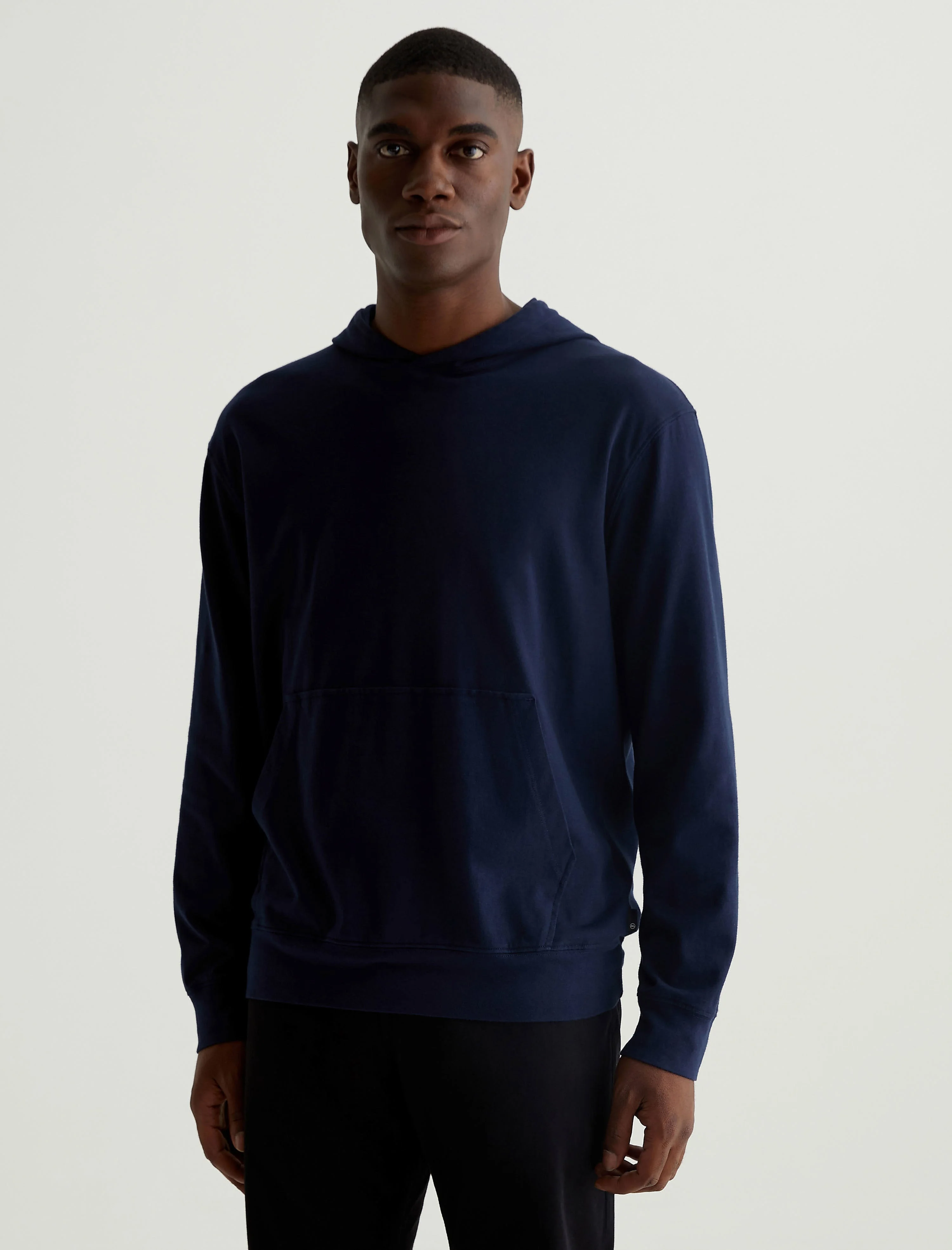 Relaxed Pullover The Wesley Hoodie in deep navy is a lightweight jersey sweatshirt complete with a front kangaroo pocket and a hoodie that is double layered for shape and structure. Our Jersey Knit offers a luxurious comfort that is unrivaled—knitted with both S-twist and Z-twist yarn to sustain longevity and stability, preventing unnecessary twisting and torquing. During the production process, the S-twist yarn is spun counter-clockwise creating a right-handed twill. The Z-twist yarn works in opposition, spinning clockwise for a left-handed twill. This opposition—when working together—yields a softer, more durable fabrication and gives strength to the yarn making it more difficult to pull apart. Designed in 100% Cotton. DETAILS & FIT Model is wearing size M. - Body Length: 28" - Sleeve Length: 25" - Chest Width: 45" FABRIC & CARE Light Cotton Jersey, 100% Cotton