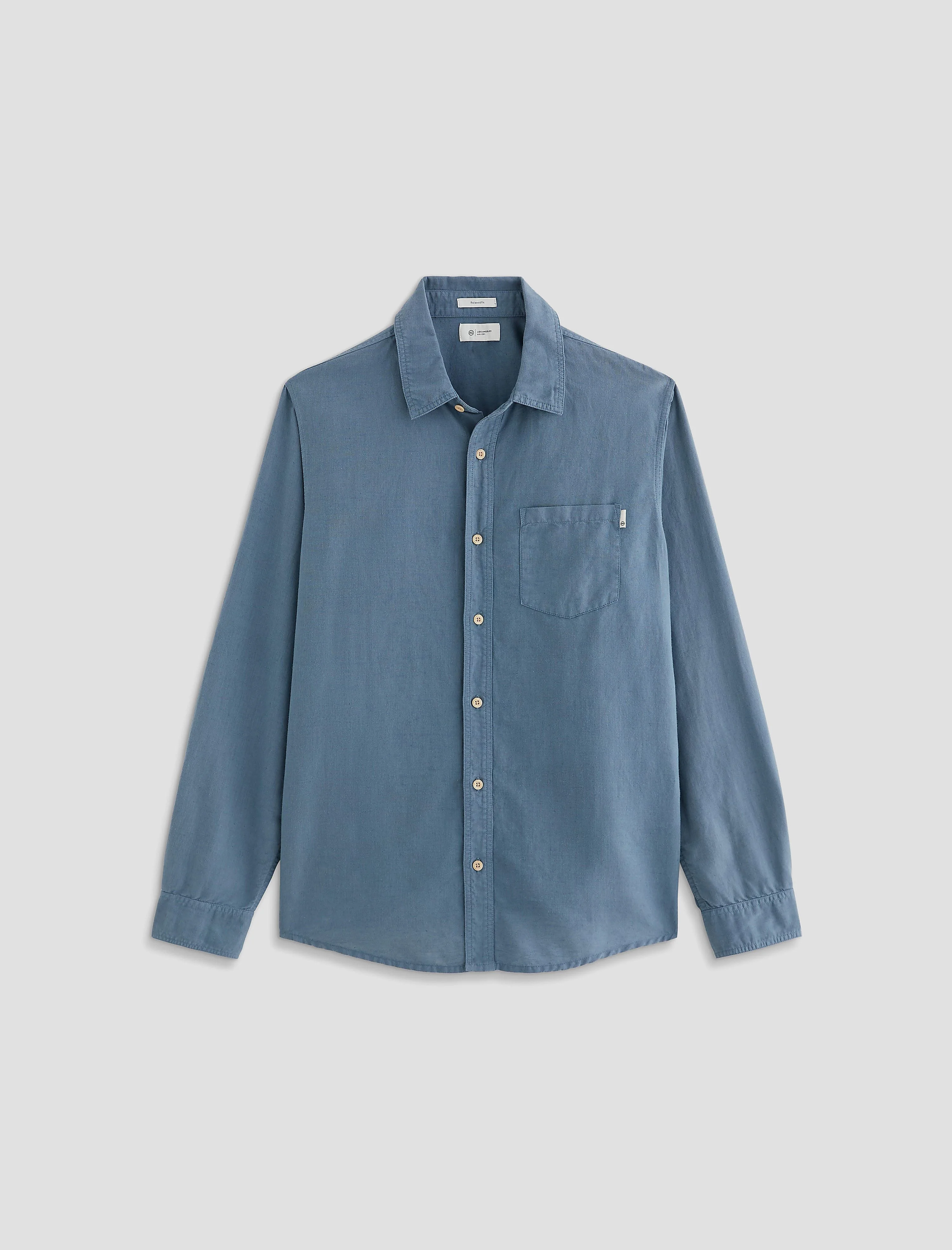 Relaxed Button-Up Shirt Crafted from a breathable linen-cotton blend, the Wesley Shirt delivers lightweight comfort in a relaxed silhouette. This short-sleeve button-up features a single flap pocket at the chest and a clean front placket. Finished in Shore Break—a soft, washed blue shade. DETAILS & FIT Model is wearing size M. - Body Length: 29 1/2" - Sleeve Length: 25 1/2" - Chest Width: 45 1/2" FABRIC & CARE Essential Linen Shirting, 56% Linen, 44% Cotton