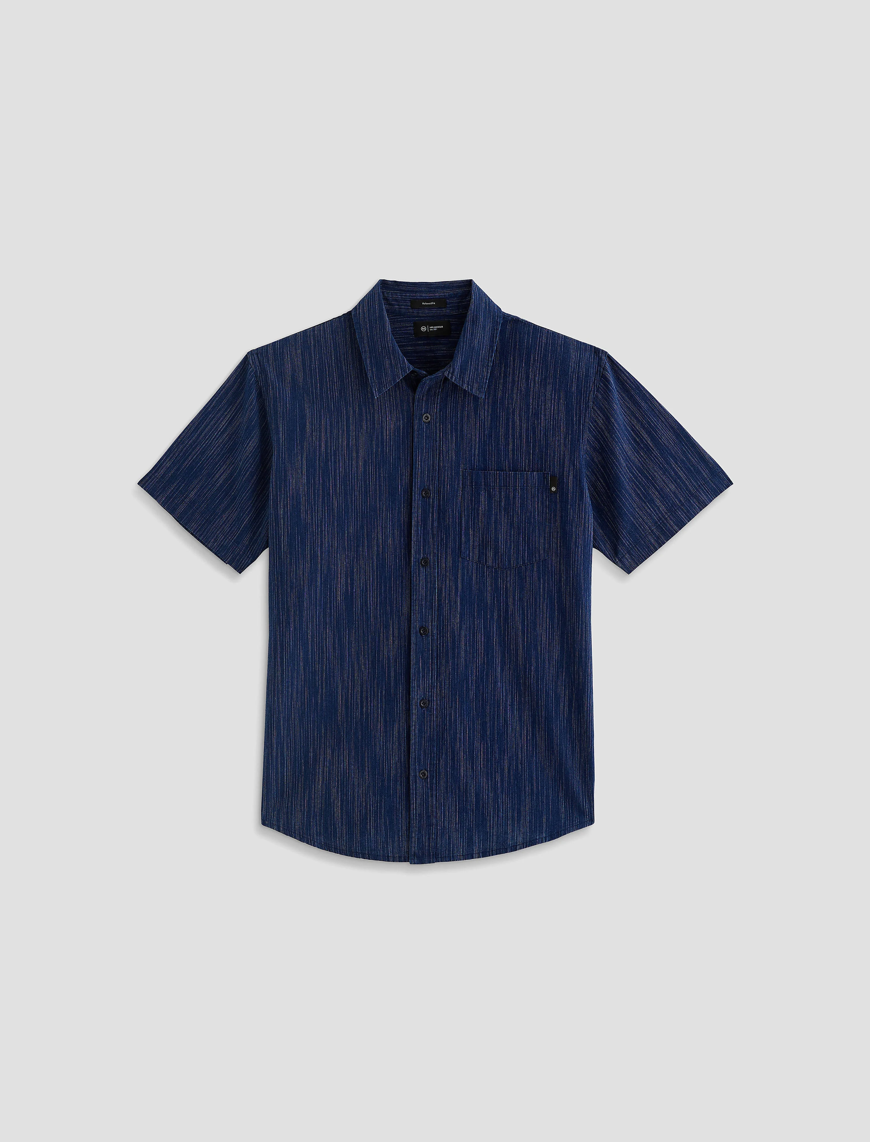 Relaxed Button-Up Shirt The Wesley Short Sleeve Shirt is a relaxed button-up made from Chambray Irate Yarn Dye in a blue wash. Finished with a front chest pocket, it delivers an easy, laid-back look with a touch of texture. DETAILS & FIT Model is wearing size M. - Body Length: 29 1/2" - Sleeve Length: 25 1/2" - Chest Width: 9 1/2" FABRIC & CARE Chambray Ikat Yarn Dye, 100% Cotton