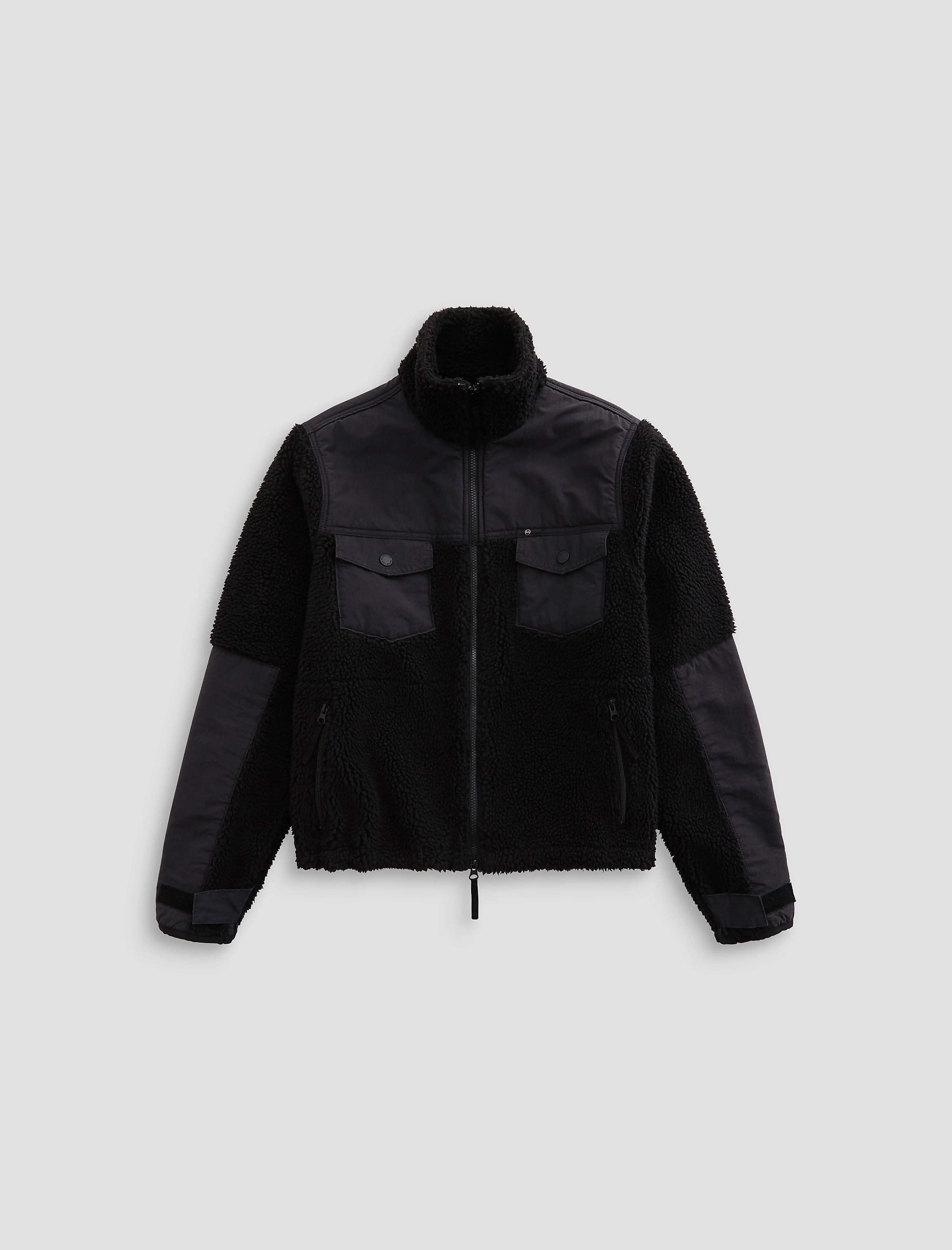 Relaxed Fleece Jacket Wylie is a black fleece jacket with contrast poplin panels. Relaxed fit, denim jacket detailing, double-needle topstitching. A classic fleece style with sport utility elements, including underarm zip vents, a high neck collar, and hook-and-loop fasteners at the cuffs for a performance appeal. Complete with an elasticized waist cord and rubberized chest snap-button closures with webbing reinforcement. DETAILS & FIT Model is wearing size M. - Body Length: 27" - Sleeve Length: 27 1/4" - Chest: 48" FABRIC & CARE Black Sherpa, 88% Cotton, 12% Nylon, 100% Polyester Shell