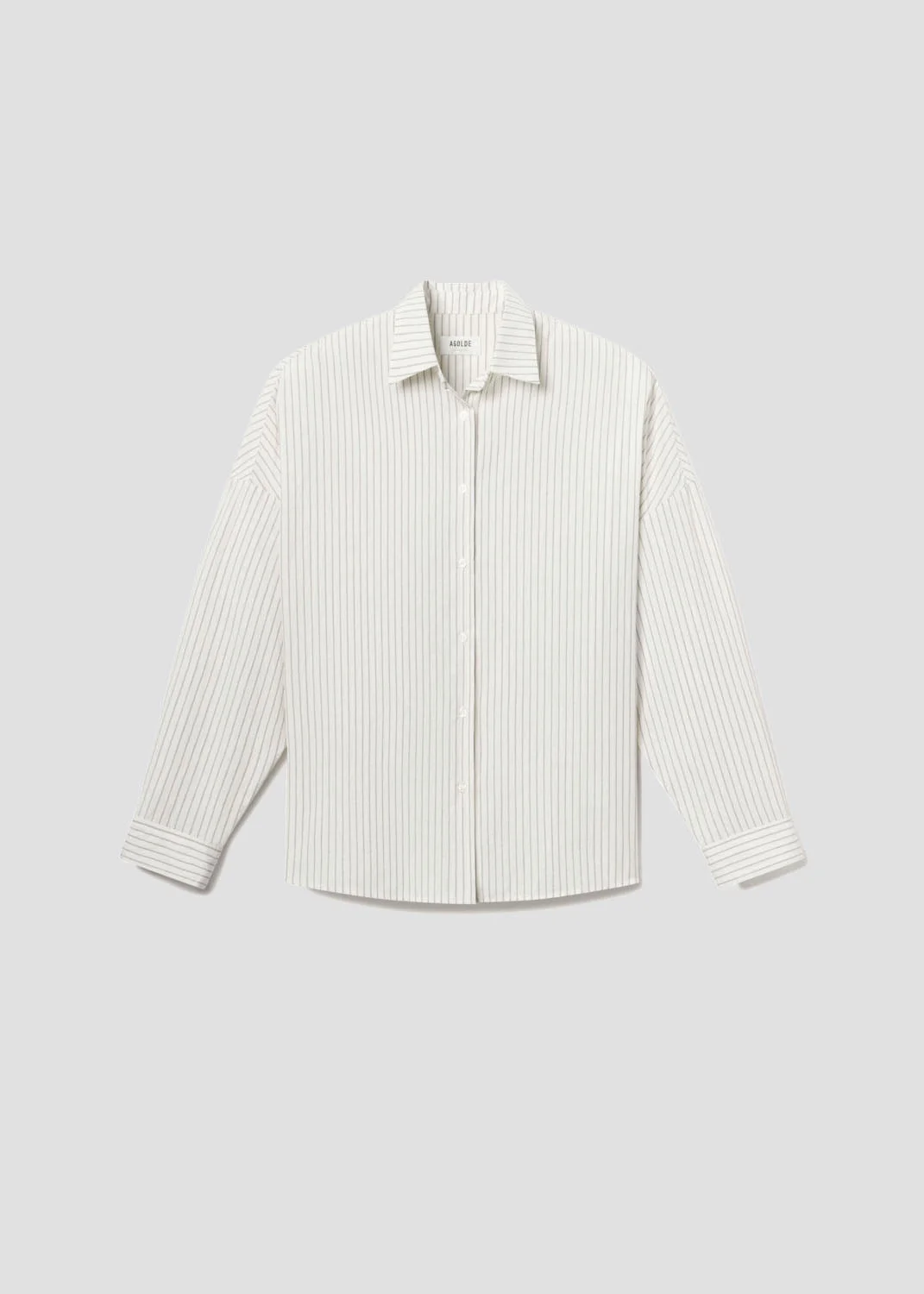 Crafted in a Japanese cotton poplin, tis casual shirt features a straight hem and point collar. This fit is true to size. Looks Like: Grey and white stripe Feels Like: Midweight yet breathable poplin MORE DETAILS Body Length: 31 1/2" Shoulder to Shoulder: 22 3/4" Sleeve Length: 25" Model is 6'2" and wearing a size Medium Fabric: 100% Cotton Care Instructions: Machine wash cold. Made in USA with imported materials A4039-1801-GIBST