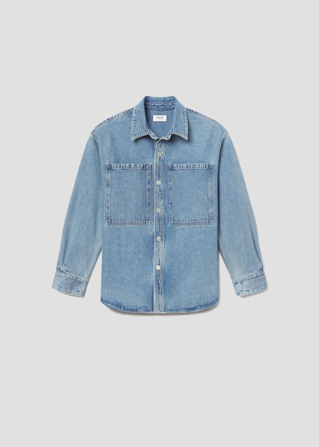 Oversized 90's inspired vintage denim shirt with triple-needle stitching detailing and elongated pockets with snap pockets. This fit is true to size. Looks Like: Saturated light indigo Feels Like: Zero stretch regenerative cotton MORE DETAILS Body Length: 32" Shoulder to Shoulder: 22 3/4" Sleeve Length: 25 1/4" Model is 6'2" and wearing a size Medium Fabric: 100% Regenerative Cotton Care Instructions: Machine wash cold. Made in Turkey with imported materials A4031B-1206-CIRT