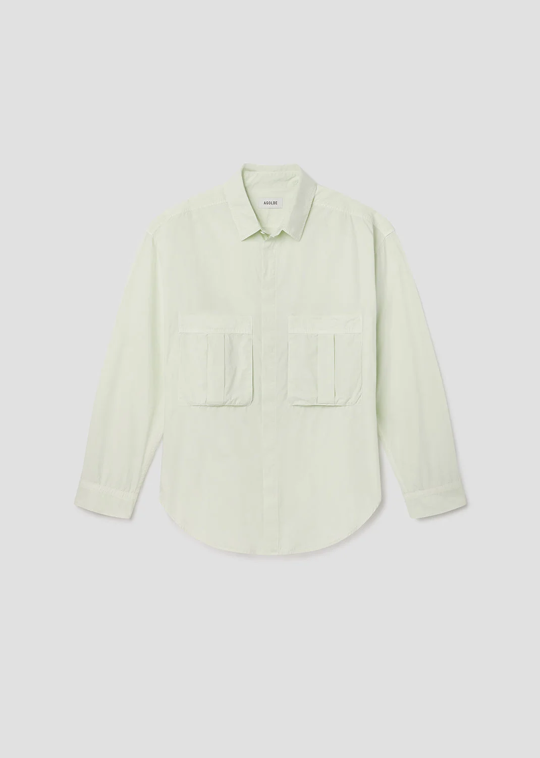 The Clark Shirt is designed with clean utility pockets and a timeless, refined shape. Crafted from lightly structured organic cotton, it offers a natural, straightforward feel with everyday ease. A versatile essential that dresses up or down effortlessly. This fit is true to size. Looks Like: Light seafoam green shirt with pleated front pockets Feels Like: Lightly structured cotton with a natural, straightforward feel MORE DETAILS Model is 6'2" and wearing a size Medium Fabric: 100% Organic Cotton Care Instructions: Machine wash cold. Made in USA with imported materials A4069-1921-MNCRM