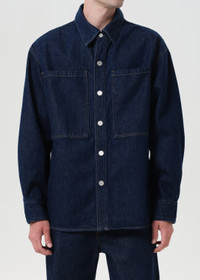 A long-sleeve button-up cut from rigid, heavyweight denim in a clean dark rinse. Crafted from 100% Regenerative Cotton with a soft, wearable hand. Structured, minimal, and true to size. This fit is true to size. Looks Like: Clean dark indigo denim long sleeve button front collared shirt Feels Like: Rigid, non stretch cotton denim with a soft hand for all day wearability MORE DETAILS Body Length: 31 1/2" Shoulder to Shoulder: 23" Sleeve Length: 24 7/8" Model is 6'2" and wearing a size Medium Fabric: 100% Regenerative Cotton Care Instructions: Machine wash cold. Made in Turkey with imported materials A4031-1810-NSE