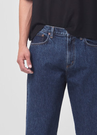 The Curtis is a classic mid-rise with a relaxed top block into an easy, straight leg that tapers at the ankle. This fit is true to size. Looks Like: Deep medium indigo Feels Like: Non-stretch regenertive cotton with an easy drape MORE DETAILS Closure: Zipper Fly Rise: 12" Inseam: 30 1/2" Leg Opening: 14" Model is 6'2" and is wearing a Size 32 Fabric: 100% Regenerative Cotton Care Instructions: Machine wash cold inside out with like colors. Do not bleach. Tumble dry low. Made in USA with imported materials A648-1206-PNDLM