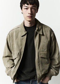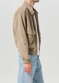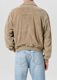 A medium-to-light sandy brown bomber jacket crafted from super soft, luxe suede. Designed with a clean zip front and utilitarian pocket detailing, it delivers a refined, elevated take on a classic silhouette. This fit is true to size. Looks Like: Medium to light sandy brown bomber jacket Feels Like: Super soft luxe suede MORE DETAILS Model is 6'2" and wearing a size Medium Fabric: 100% Suede Care Instructions: Machine wash cold. Made in India with imported materials A4070-AZNA
