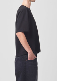 Our box tee. Cut with elongated sleeves and hem at hips length. This fit is true to size. Looks Like: Clean black Feels Like: Lightweight jersey cotton MORE DETAILS Body Length: 25 1/2" Shoulder to Shoulder: 20 1/2" Sleeve Length: 10 1/2" Model is 5'10" and wearing a size Small Fabric: 100% Cotton Care Instructions: Machine wash cold. Made in USA with imported materials A1017-1700-BLK