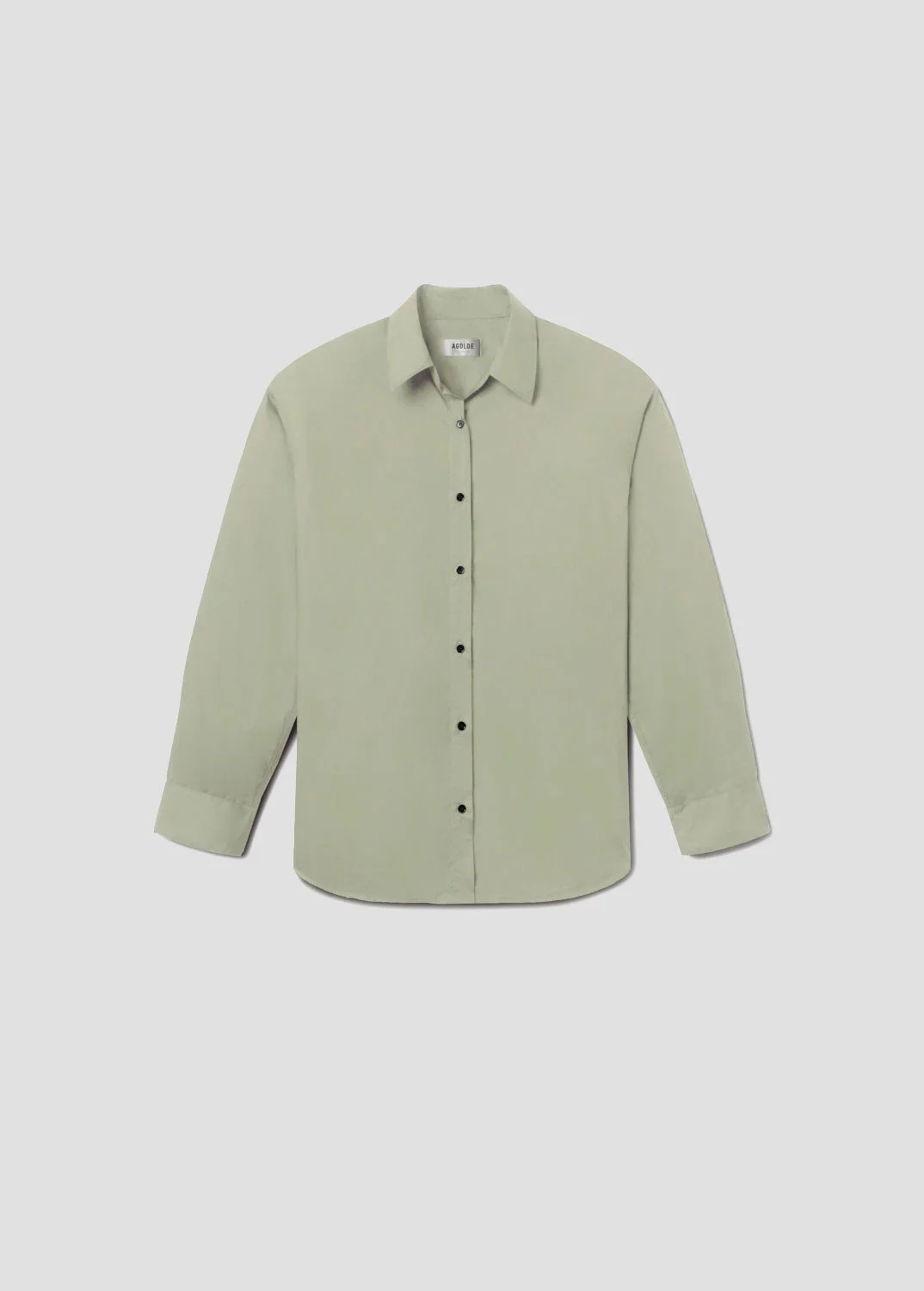 Closet core item must-have. Long sleeve poplin shirt with unique reverse seam detailing and a straight hem. This fit is true to size. Looks Like: Pale khaki green Feels Like: Midweight cotton poplin MORE DETAILS Body Length: 31 1/2" Shoulder to Shoulder: 22 3/4" Sleeve Length: 24 3/4" Fabric: 100% Cotton Care Instructions: Machine wash cold. Made in USA with imported materials A4038-1769-PTRG