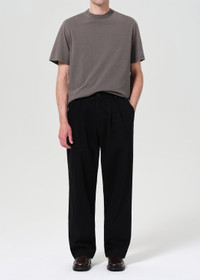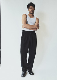 A black trouser with front pleat detailing. True to size with a relaxed, tailored fit. This fit is true to size. Looks Like: Black trouser with front pleat detailing Feels Like: Non stretch, rigid twill MORE DETAILS Closure: Zipper Fly Rise: 14 3/4" Inseam: 30 1/2" Leg Opening: 19" Model is 6'2" and is wearing a Size 32 Fabric: 100% Regenerative Cotton Care Instructions: Machine wash cold inside out with like colors. Do not bleach. Tumble dry low. Made in Turkey with imported materials A669-1879-BLK