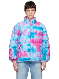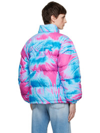 Down-filled quilted nylon poplin jacket. Graphic pattern printed throughout. · Funnel neck · Zip closure · Zip pockets · Elasticized cuffs · Logo embroidered at back · Full taffeta lining Supplier color: Pink/Blue Fill: 90% down, 10% feather. Body: 100% polyamide. Lining: 100% polyester. Made in Turkey 231319M178000
