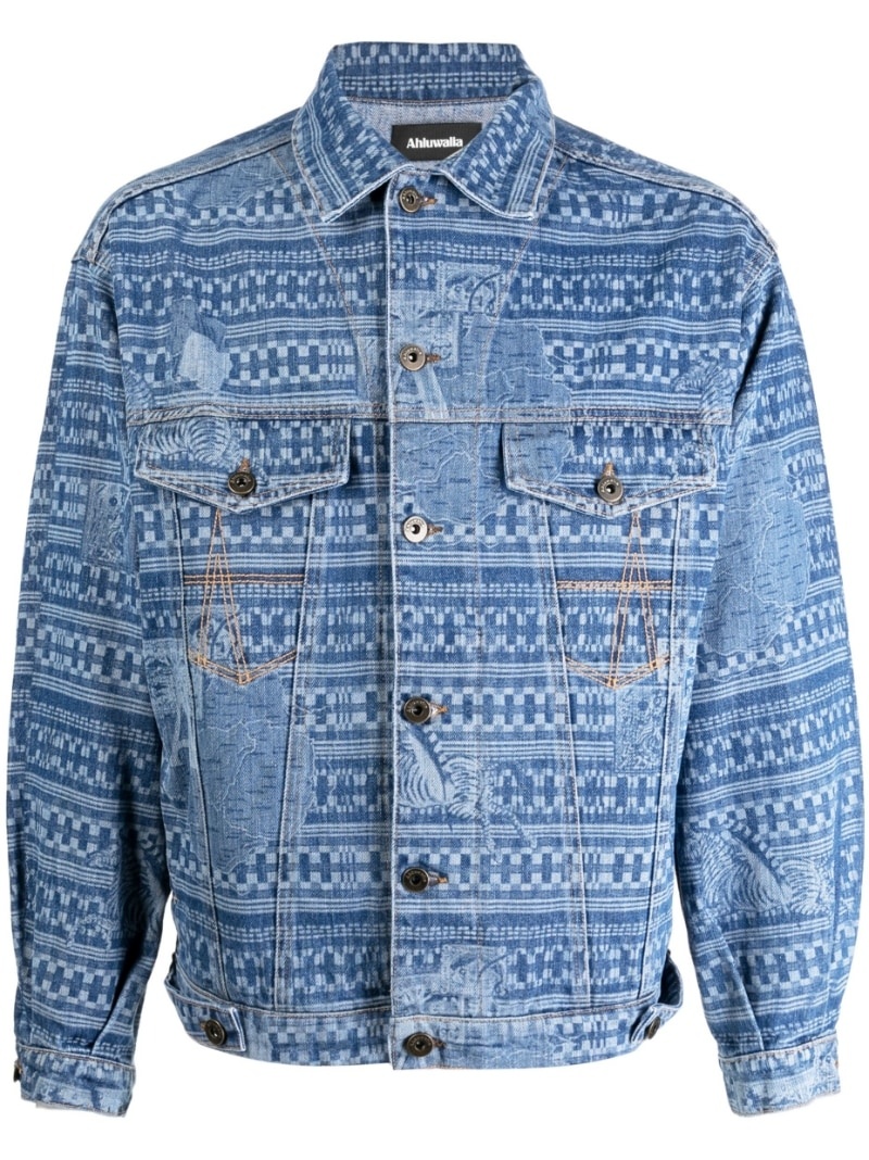 abstract pattern denim jacket abstract pattern denim jacket from Ahluwalia featuring indigo blue, cotton, abstract pattern print, contrast stitching, spread collar, front button fastening, long sleeves, buttoned cuffs, two chest flap pockets and straight hem. Made in Italy Composition Cotton 100% SIZE & FIT Model measurements Height 6 ft 2 in(1.87 m) Bust/Chest 35 in(89 cm) Hips 36.6 in(93 cm) Waist 29.5 in(75 cm)