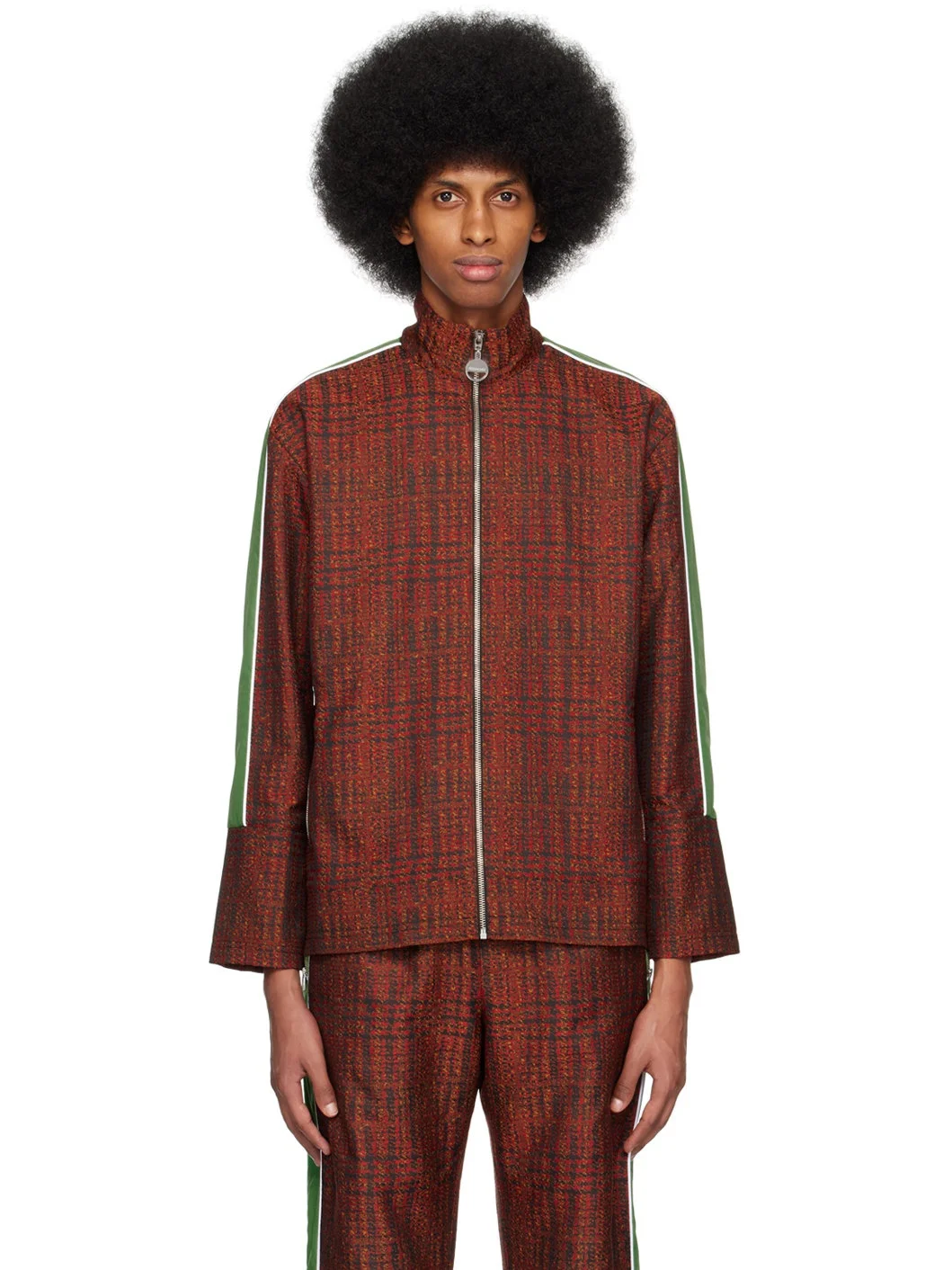 Stretch polyester and nylon-blend jacket. Jacquard check pattern throughout. · Turtleneck · Zip closure · Zip pockets · Polyester taffeta trim at sleeves · Full recycled polyester mesh lining Supplier color: Black/Red Body 1: 67% polyester, 29% polyamide, 4% elastane. Body 2: 100% polyester. Lining: 100% recycled polyester. Made in Lithuania 231291M202001