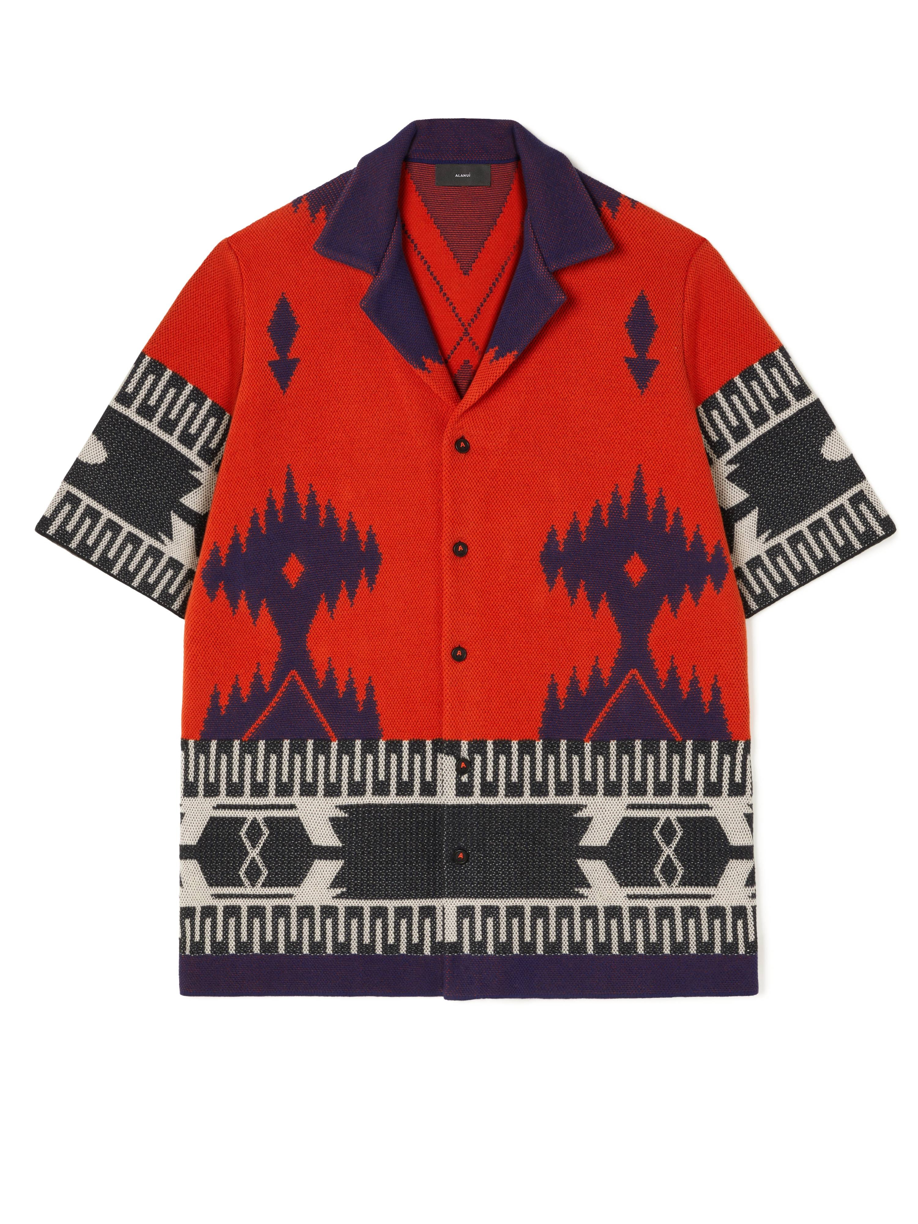 Crafted from cotton pique using double jacquard knit, the Icon Shirt features the Iconic Alanui Pattern in a summery interpretation of the signature cardigan style. Wear with matching Bermuda shorts for a striking total look. DETAILS - Product Code LMHY001R25KNI0022545 - Made In Italy - Crafted from 100% Cotton. - This item weighs 606 gr and takes four hours to be knitted and another three to be assembled. - The model is 189 cm and wears a size M. - This item fits true to size.