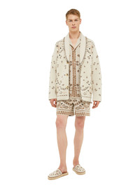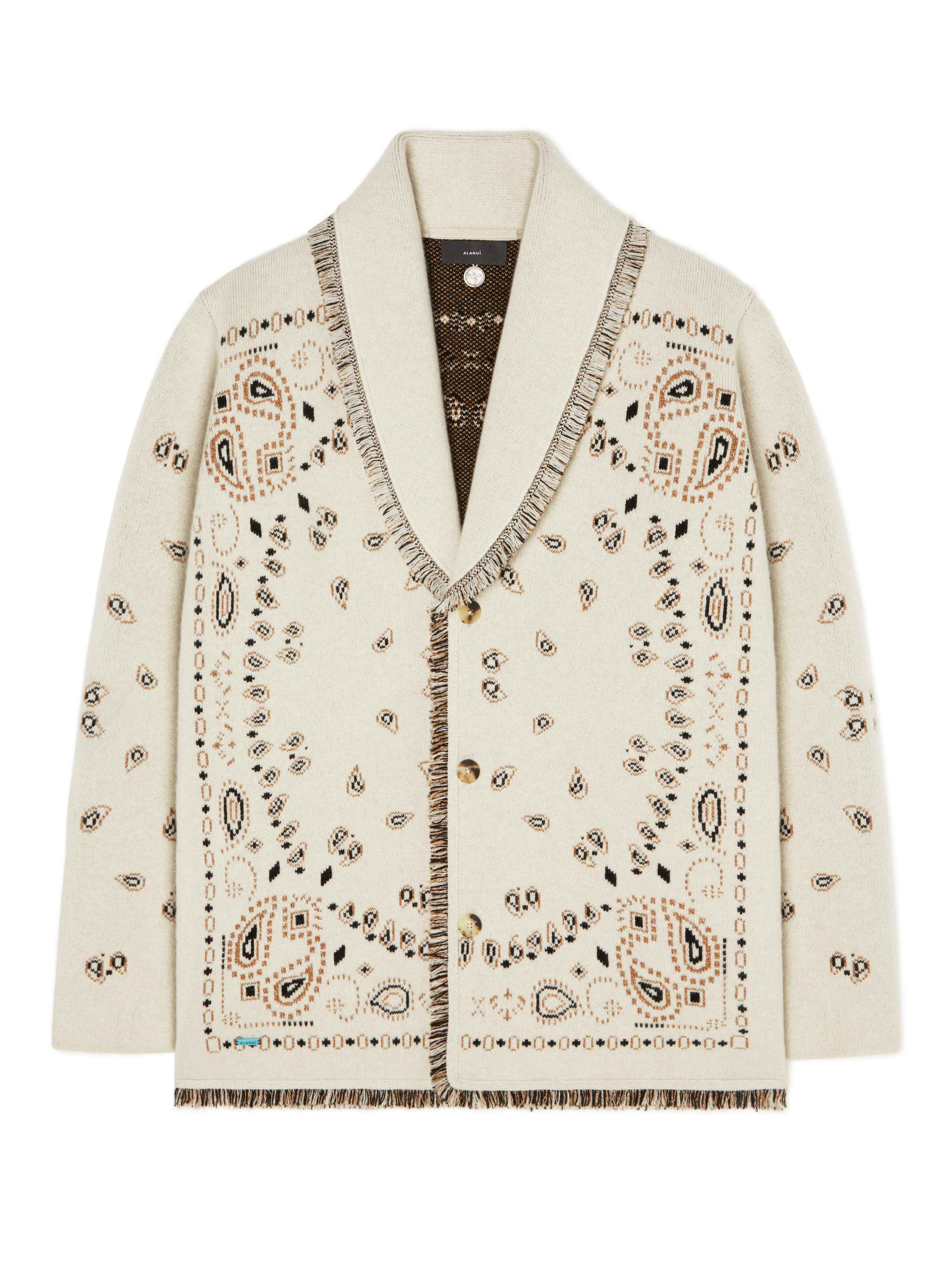 Another essential Alanui style, the Bandana Jacquard Cardigan embraces an India-inspired color palette for Spring / Summer 2024. Lovingly crafted from a cashmere blend using double jacquard knit, each cardigan pairs the original Icon fit with the iconic Bandana Pattern to create a true statement look. Featuring real horn buttons and multicolored fringed edges. PRODUCT DETAILS Product Code LMHB039R24KNI0066160 Made in Italy. Crafted from 90% Cashmere and 10% Linen. This item weighs 0,727 kg and takes ten hours to be complete. The model is 185 cm and wears a size M.