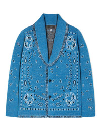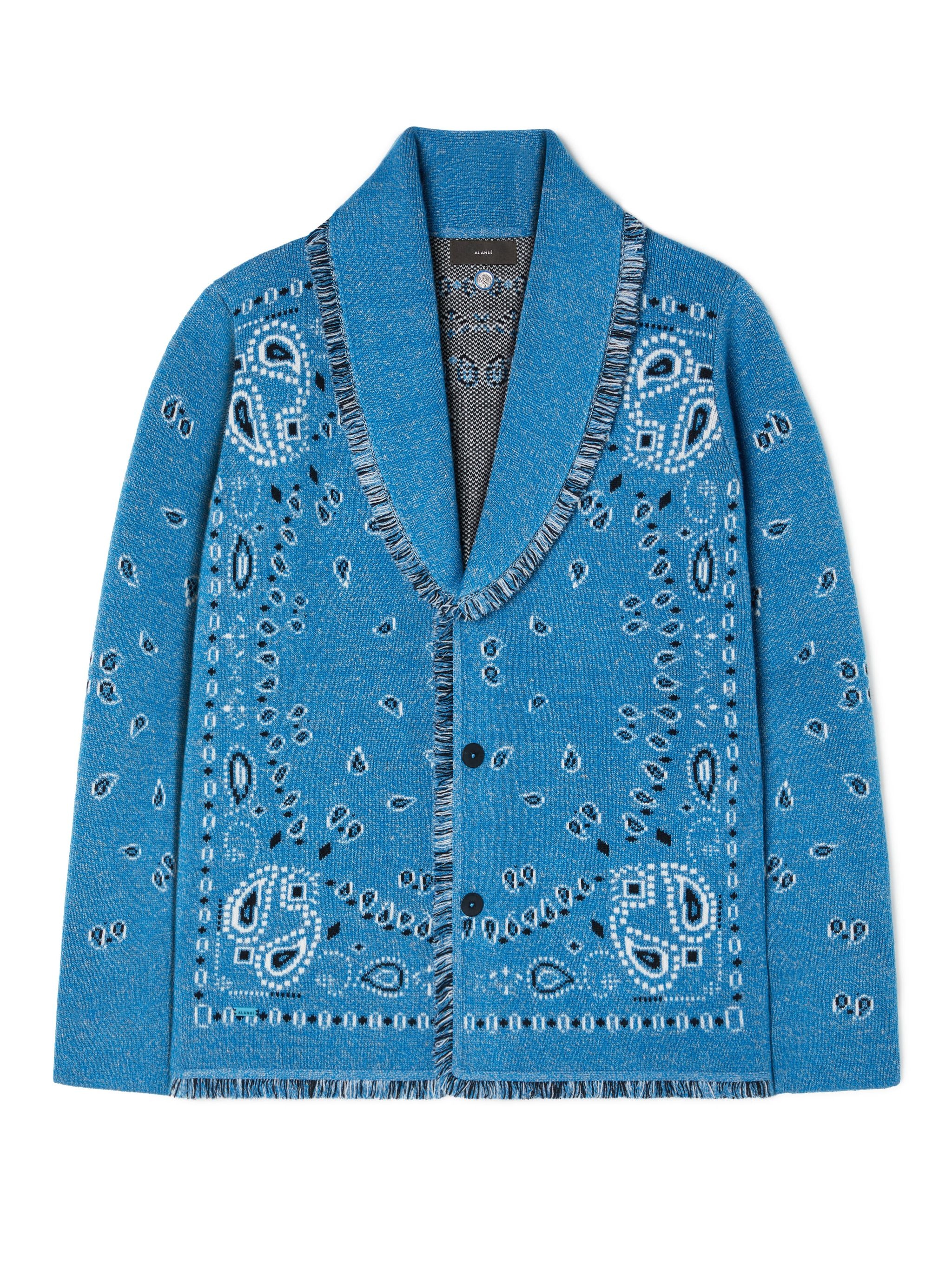 Signature style and ultimate travel companion, the Alanui cardigan is the forever piece that will accompany you on countless adventures. Meticulously crafted from the finest cashmere using double jacquard knit, the Icon Bandana Cardigan pairs the original Icon fit with the Iconic Bandana Pattern to create a true statement look. Each cardigan weighs 1 kg, takes 10 hours to complete and features real horn buttons and multicolored fringed edges. PRODUCT DETAILS Made in Italy The model is 187 cm and wears a size M. Product Code LMHB030S23KNI0024884