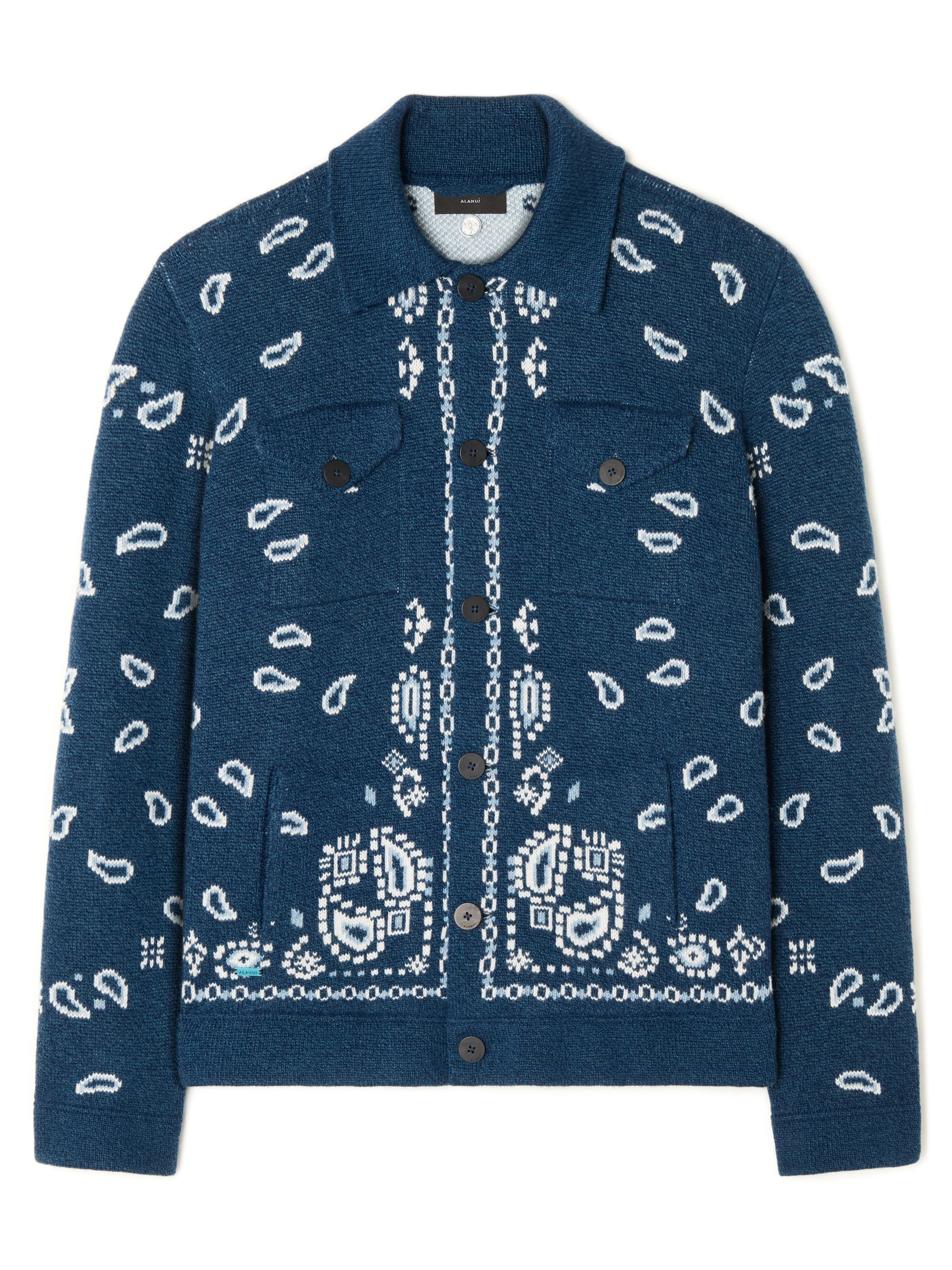 Fusing two signature Alanui codes, the Bandana Jacquard Cardigan brings a bold edge to a classic silhouette. Lovingly crafted from pure cashmere using intricate double jacquard knit, it combines the original Icon fit with the distinctive Bandana Pattern to create a truly standout style. Finished with real horn buttons and multicolored fringed edges. DETAILS - Product Code LMHQ007E25KNI0014942 - Crafted from 82% Virgin Wool 18% Cashmere. - The model is 189 CM and wears a size M. - This item fits true to size.