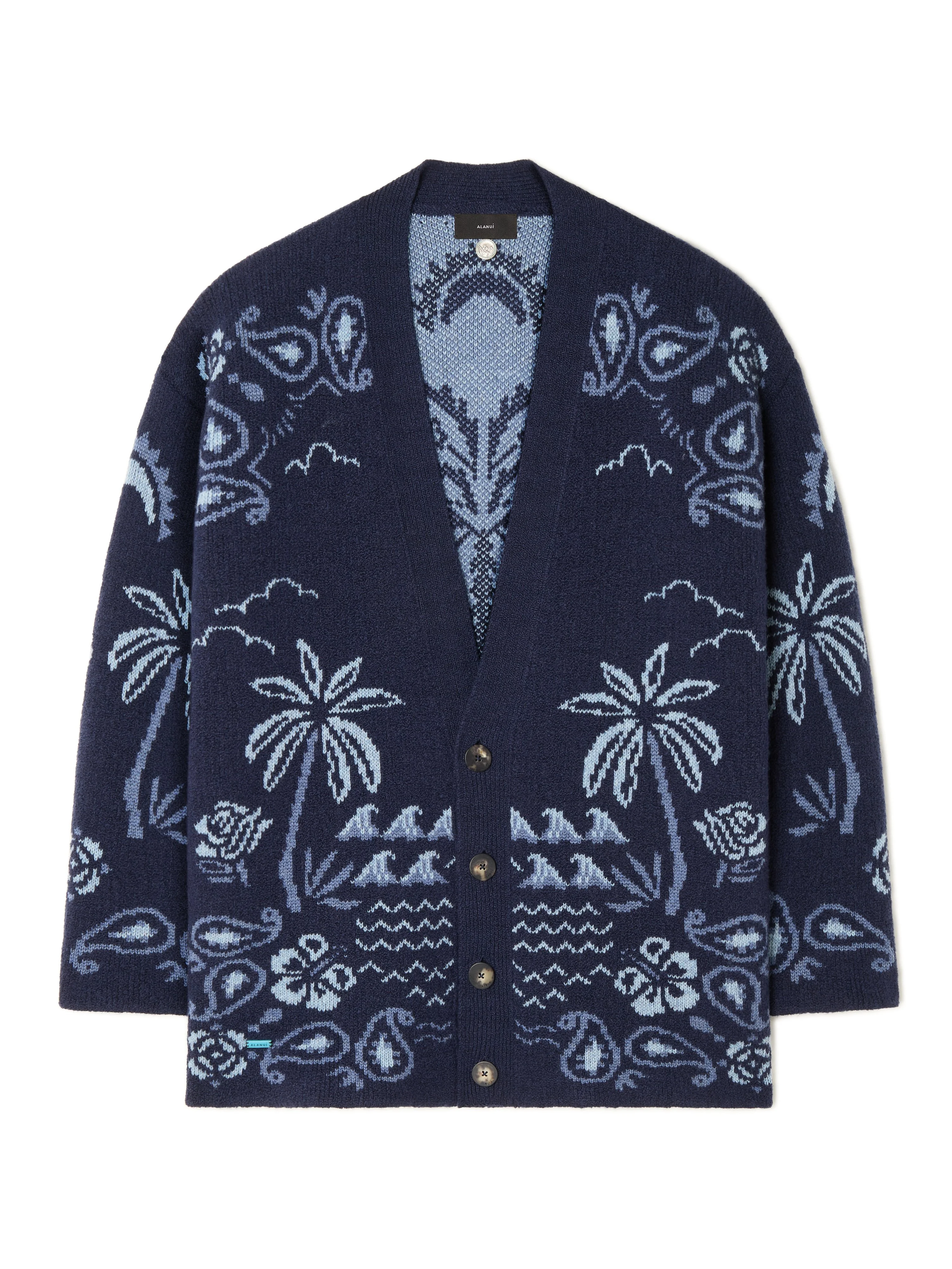 This Fall / Winter 2025, Alanui celebrates the splendor of the natural world. Palms, ocean waves, and hibiscus flowers form a textured foulard motif to remind us that paradise is all around us. The Glimpse of Eden Cardigan is lovingly crafted from a cashmere, wool, and cotton blend using intricate double jacquard knit on a classic cardigan fit. Finished with real horn buttons. DETAILS - Product Code LMHB027E25KNI0034642 - Crafted from 79% Wool 12% Cashmere 8% Cotton 1% Polyammide. - The model is 189 CM and wears a size M. - This item fits true to size.