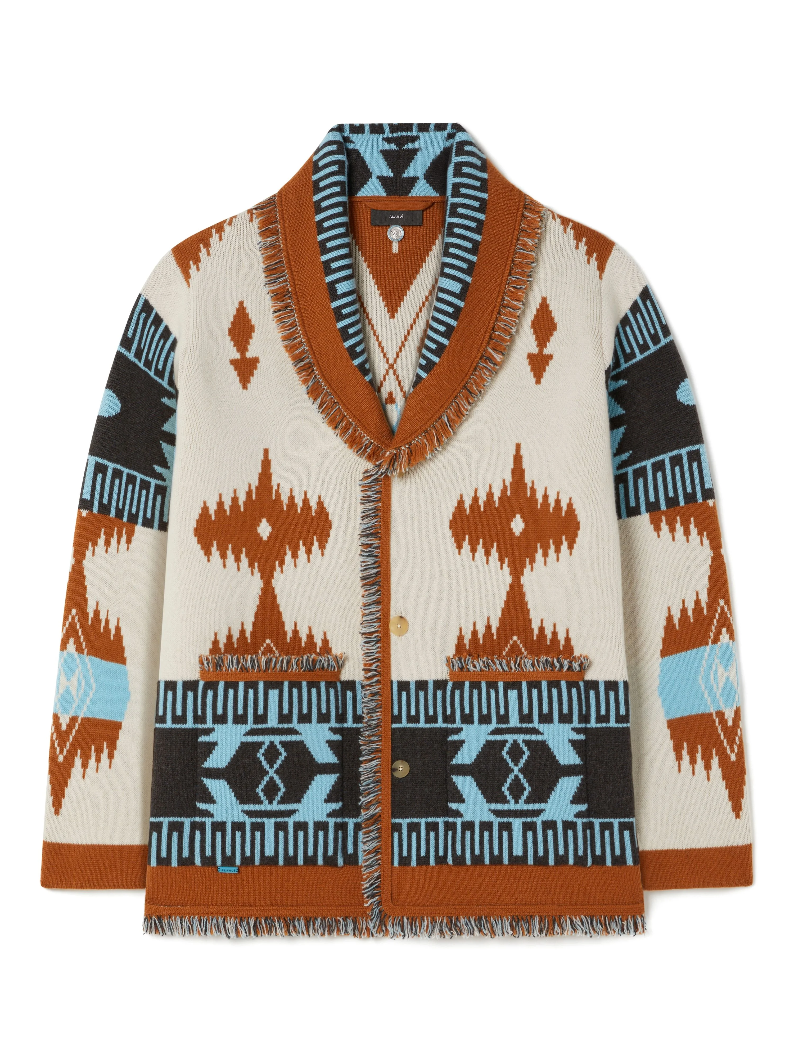 A signature style that gets better with every adventure, the Icon Jacquard Cardigan is the wardrobe staple that was made for traveling. Pairing the original Icon fit with the Iconic Alanui Pattern to create a timeless luxury style, each cardigan is meticulously crafted from the finest cashmere using double jacquard knit. Featuring real horn buttons and multicolored fringed edges. DETAILS - Product Code LMHB038R25KNI0010160 - Made In Italy - Crafted from 100% Cashmere. - This item weighs 962 gr and takes four hours and an half to be knitted and another six to be assembled. - The model is 189 cm and wears a size M. - This item fits true to size.