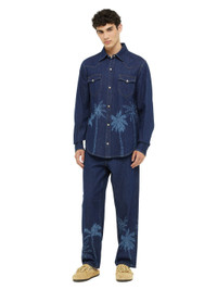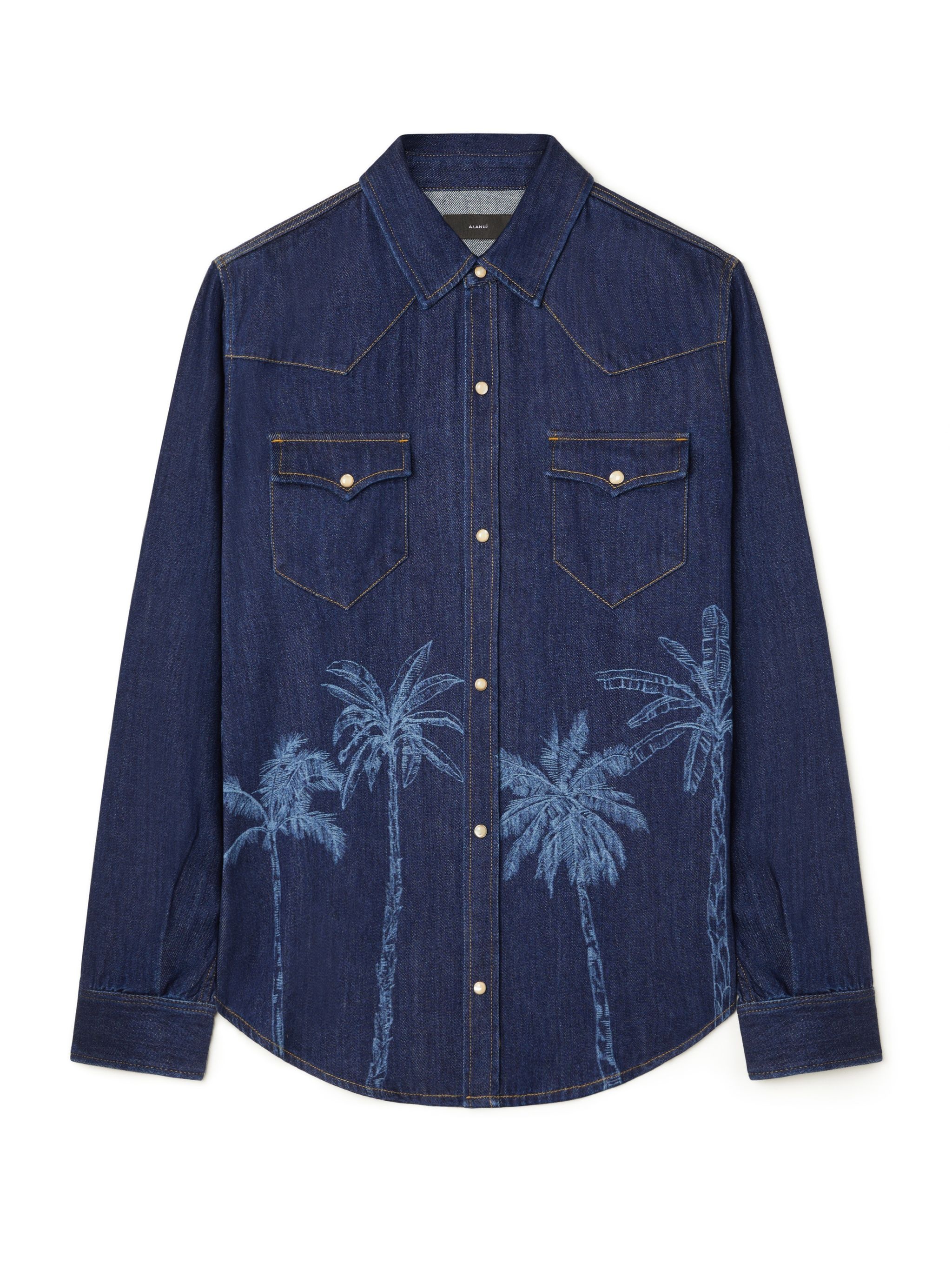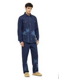 The Jungle Denim Shirt is laser-printed with a botanical ‘Toile de Jouy’ pattern inspired by 18th-century textiles. A subtle palm design that conjures up the lush tropical landscape. Featuring a regular fit and mother-of-pearl snap buttons. PRODUCT DETAILS Product Code LMYD007R24DEN0044000 Made in Italy. Crafted from 100% Cotton. The model is 189 cm and wears a size M. This item fits true to size.