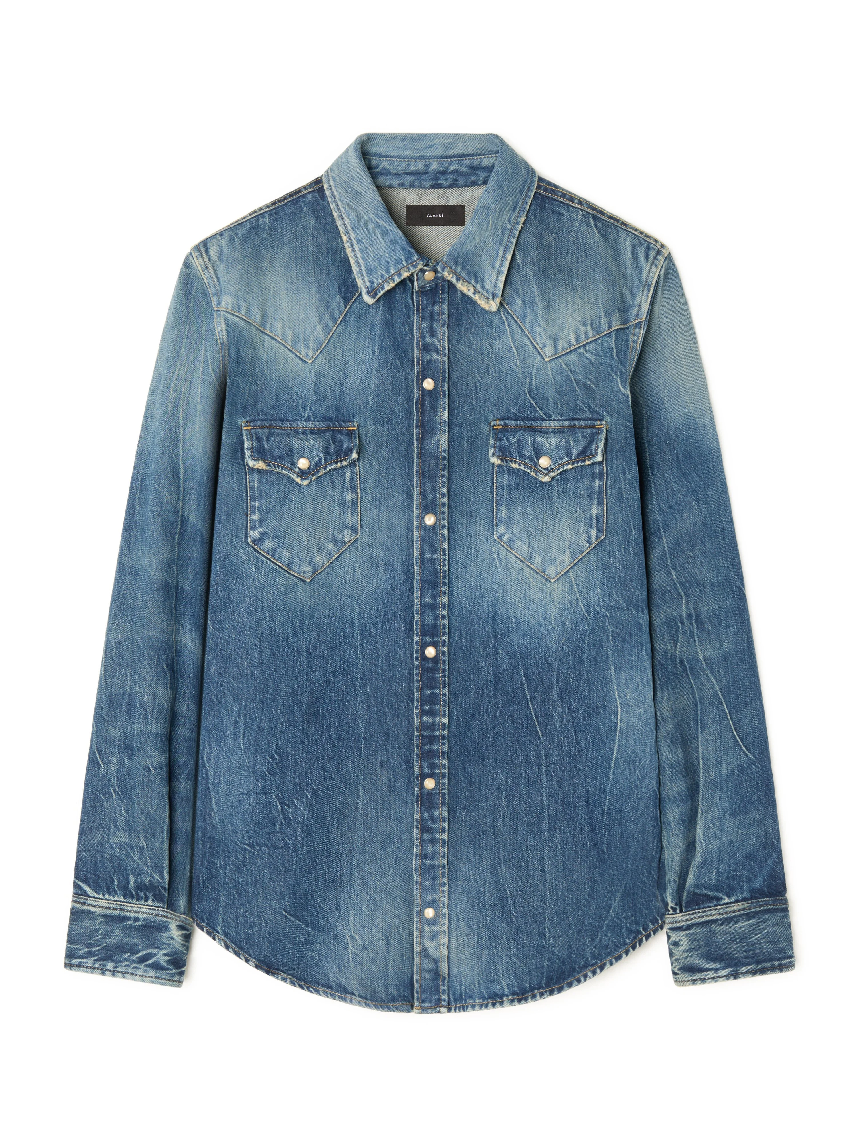 A wardrobe essential with a relaxed spirit, the Pacific Roads Denim Shirt is crafted from medium-wash denim. Finished with ripped detailing and mother-of-pearl snap buttons. DETAILS - Product Code LMYD007E25DEN0044700 - Crafted from 100% Cotton . - The model is 189 CM and wears a size M. - This item fits true to size.