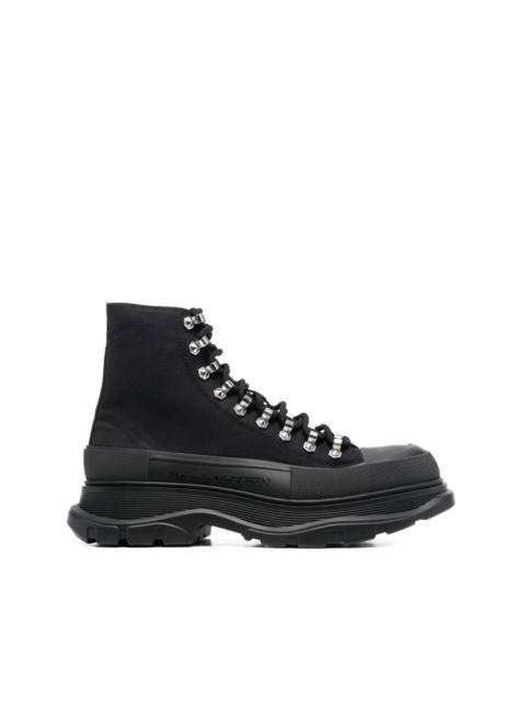70mm chunky lace-up boots beige canvas leather trim front lace-up fastening round toe chunky rubber sole 70mm low heel Made in Italy Composition Sole: Rubber 100% Outer: Canvas 100% Lining: Calf Leather 100% SIZE & FIT Measurement HEEL 1.77 in(4.5 cm) Sole height 0.98 in(2.5 cm) HEIGHT 4.33 in(11 cm)