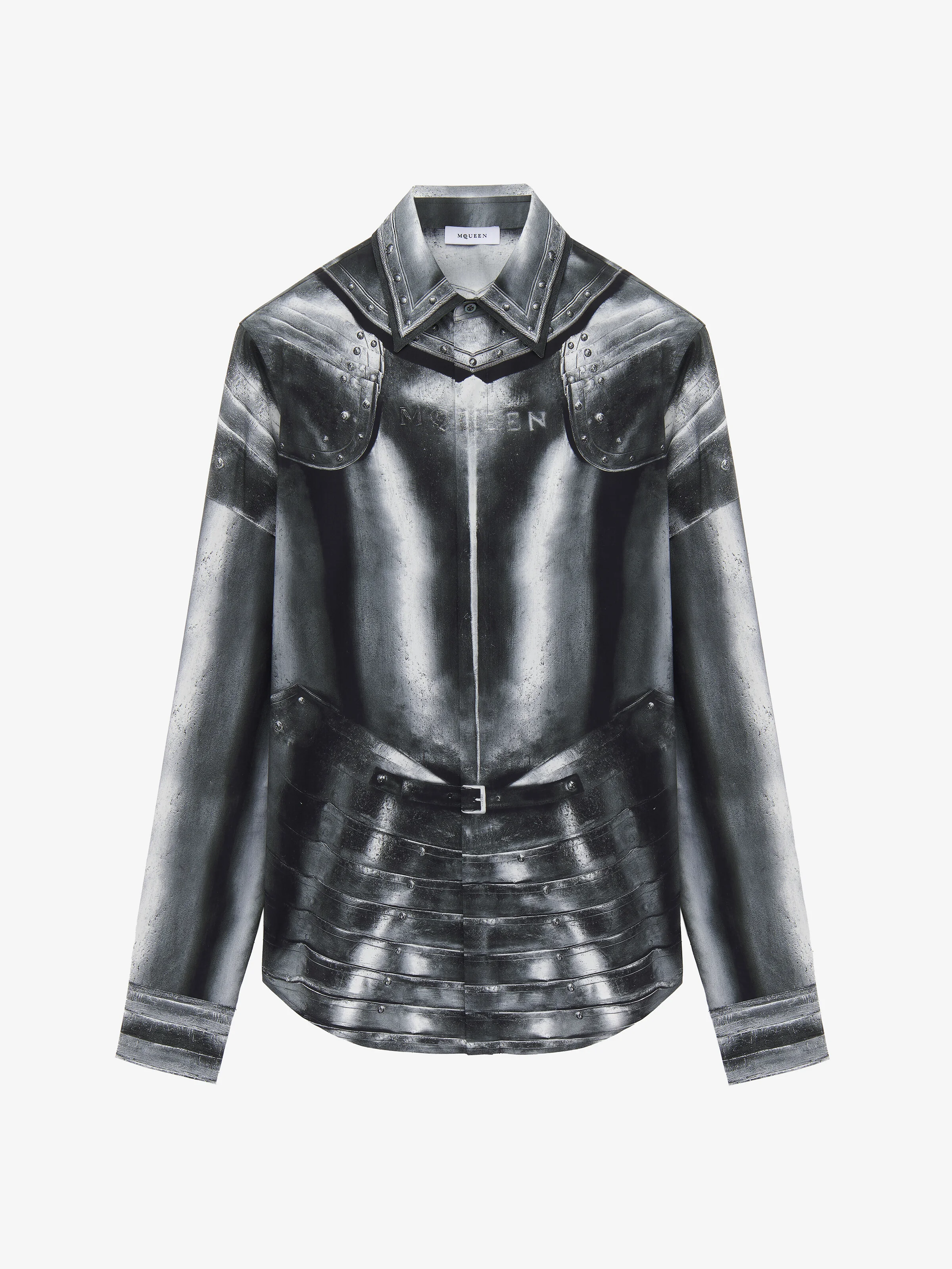 Cotton poplin shirt with an all-over Armour print. Point collar, McQueen logo and curved hem. Finished with a concealed front button fastening. Product details - Point collar - Concealed front button fastening - Product code: 839309QOABO1278 - Made in Romania - Material: 100% Cotton