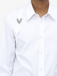 Shirt in optical white cotton poplin. Tonal harness detailing with a McQueen Arrow buckle. Finished with a curved hem and front button fastening. Product details - Point collar - Front button fastening - Product code: 814641QNAAX9000 - Made in Romania - Material: Cotton