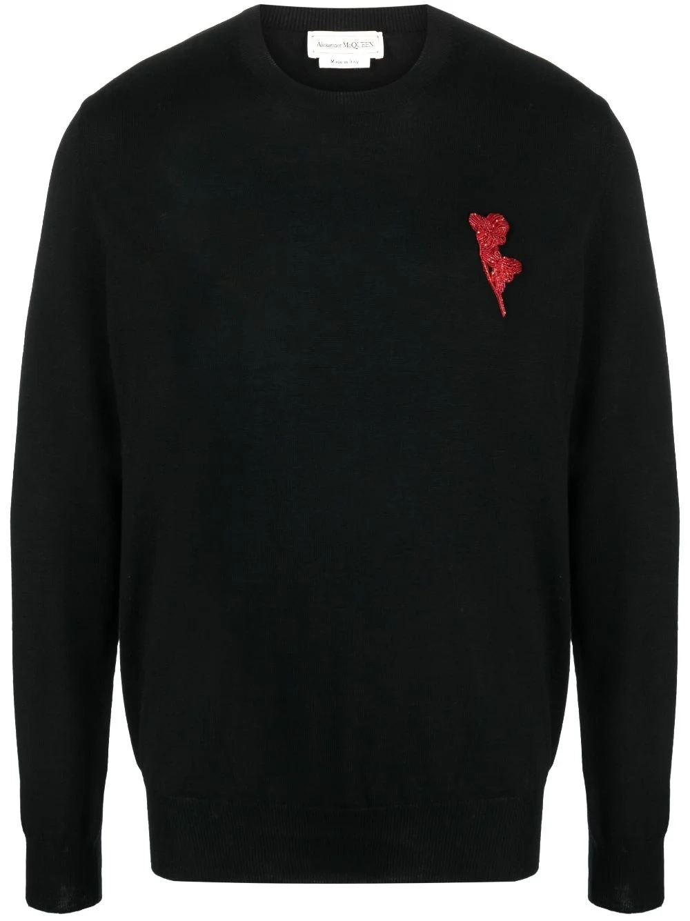 beaded wool jumper Continuing with the orchid motifs seen across the brand's fall collections, Alexander McQueen accents this simple black wool jumper with scores of scarlet beads forming the shape of the unique flower. Highlights - Black - Wool - Floral motif - Bead embellishment - Ribbed trim - Crew neck - Long sleeves - Straight hem Made in Italy Composition Wool 100%, glass 100%, Silk 100%, Plastic 100% SIZE & FIT Model measurements Height 6 ft 2 in(1.87 m) Bust/Chest 36.22 in(92 cm) Hips 37 in(94 cm) Waist 27.95 in(71 cm) FittingInformation Designed for a regular fit, offering a comfortable loose fit throughout the body The ribbed hem offers a close, comfortable fit Made with a midweight knit, this piece offers some stretch This piece fits true to size – take your usual size Washing instructions Dry Clean Only
