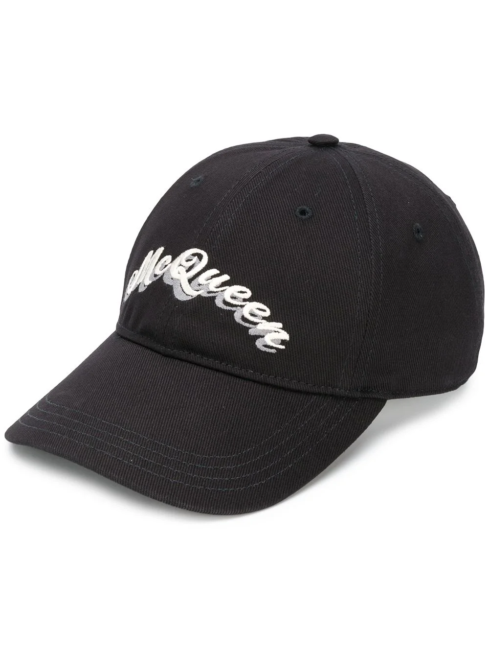 logo print baseball cap Let McQueen keep your head protected from the sun rays with this logo baseball cap. Crafted in cotton, this black and white logo embroidered cap sports an adjustable fit. Embrace 'logomania.' Featuring a curved peak, an embroidered logo to the front and an adjustable fit. Made in Italy Composition Cotton 100% Outer: Cotton 100% SIZE & FIT Measurement BRIM 2.75 in(7 cm) CIRCUMFERENCE 20.47 in(52 cm)