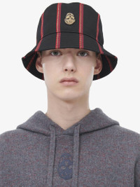 Black and red wool bucket hat featuring an all-over Blazer Stripe print. The hat is finished with an inverted gold bullion embroidered skull on the front. Product details - Sizes: XS to XL - Product code: 8172754E91Q1074 - Made in Italy - Material: Wool