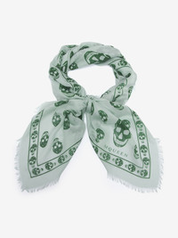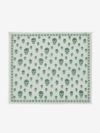 Glass and viridian green modal and silk blend foulard featuring an all-over skull motif. The foulard is detailed with a skull border and the McQueen logo. Finished with frayed edges. Product details - Dimensions: 104 x 120cm / 40.9 x 47.2 inches - Product code: 8078894943Q3966 - Made in ITALY - Material: 85% Modal , 15% Silk