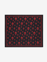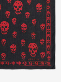 Black and red silk chiffon foulard featuring an all-over skull motif. The foulard is finished with a skull border and the McQueen logo in the bottom right corner. Product details - Dimensions: 104x120cm / 4 x 4.7 inches - Product code: 8078894Q0601074 - Made in Italy - Material: Silk
