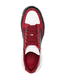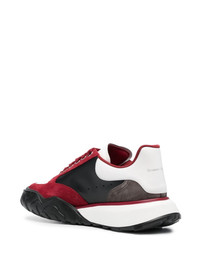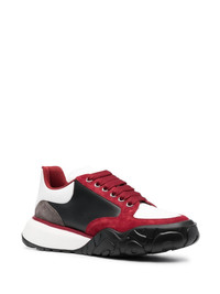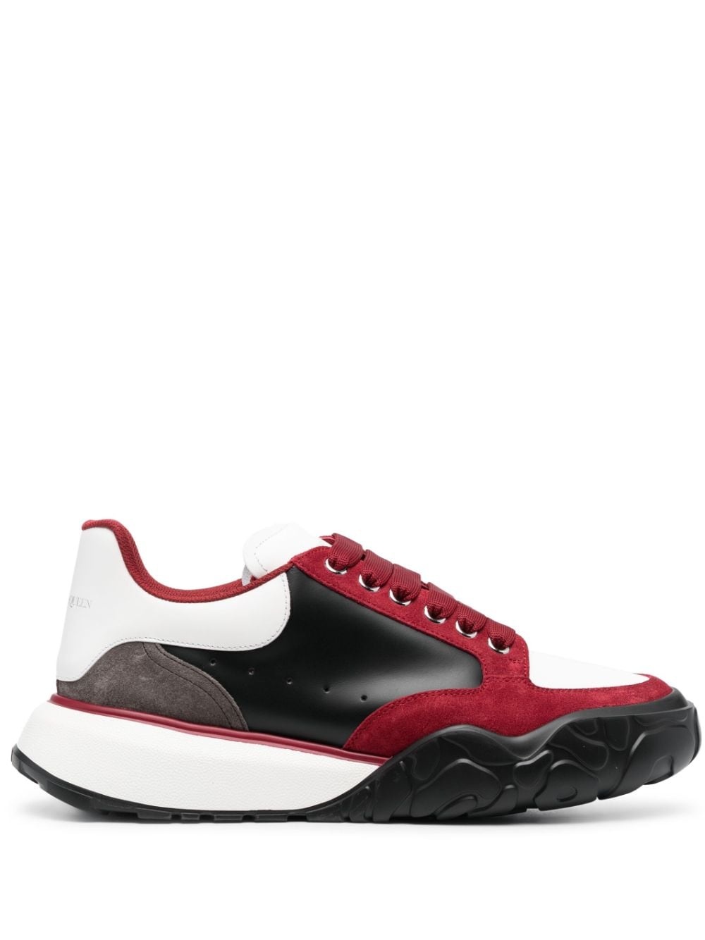 colour-block leather low-top sneakers Alexander McQueen’s pendant for sneakers strikes again. This colour-block leather pair features some suede panels for textured contrast while maintaining some branded touches like the logo-print tongue and heel counter. Highlights - Black/white/blood red - Calf leather - Colour-block panelled design - Suede panelling - Contrasting branded heel counter - Logo-print tongue - Front lace-up fastening - Round toe - Chunky rubber sole Imported Composition Lining: Calf Leather 100%, Fabric 100% Outer: Calf Leather 100% Sole: Rubber 100% SIZE & FIT Measurement HEEL 1.8 in(4.5 cm) PLATFORM 1.6 in(4 cm)