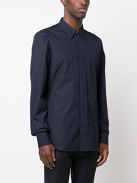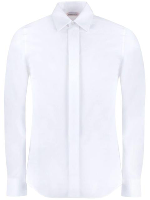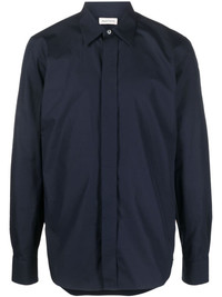 concealed-fastening cotton shirt Imagined in navy-blue, this shirt from Alexander McQueen offers a simple style. Tailored with a pointed collar and a curved hem, it features a concealed front button fastening that further enhances the minimalist aesthetic. Highlights - Navy blue - Cotton - Classic collar - Concealed front fastening - Long sleeves - Curved hem Imported Composition Cotton 100% SIZE & FIT Model measurements Height 6 ft 0 in(1.84 m) Bust/Chest 36.22 in(92 cm) Hips 35.43 in(90 cm) Waist 26.77 in(68 cm) FittingInformation Designed for a regular fit, allowing for a comfortably loose fit throughout the body Made from a midweight non-stretch fabric This piece fits true to size – take your usual size Washing instructions Dry Clean Only