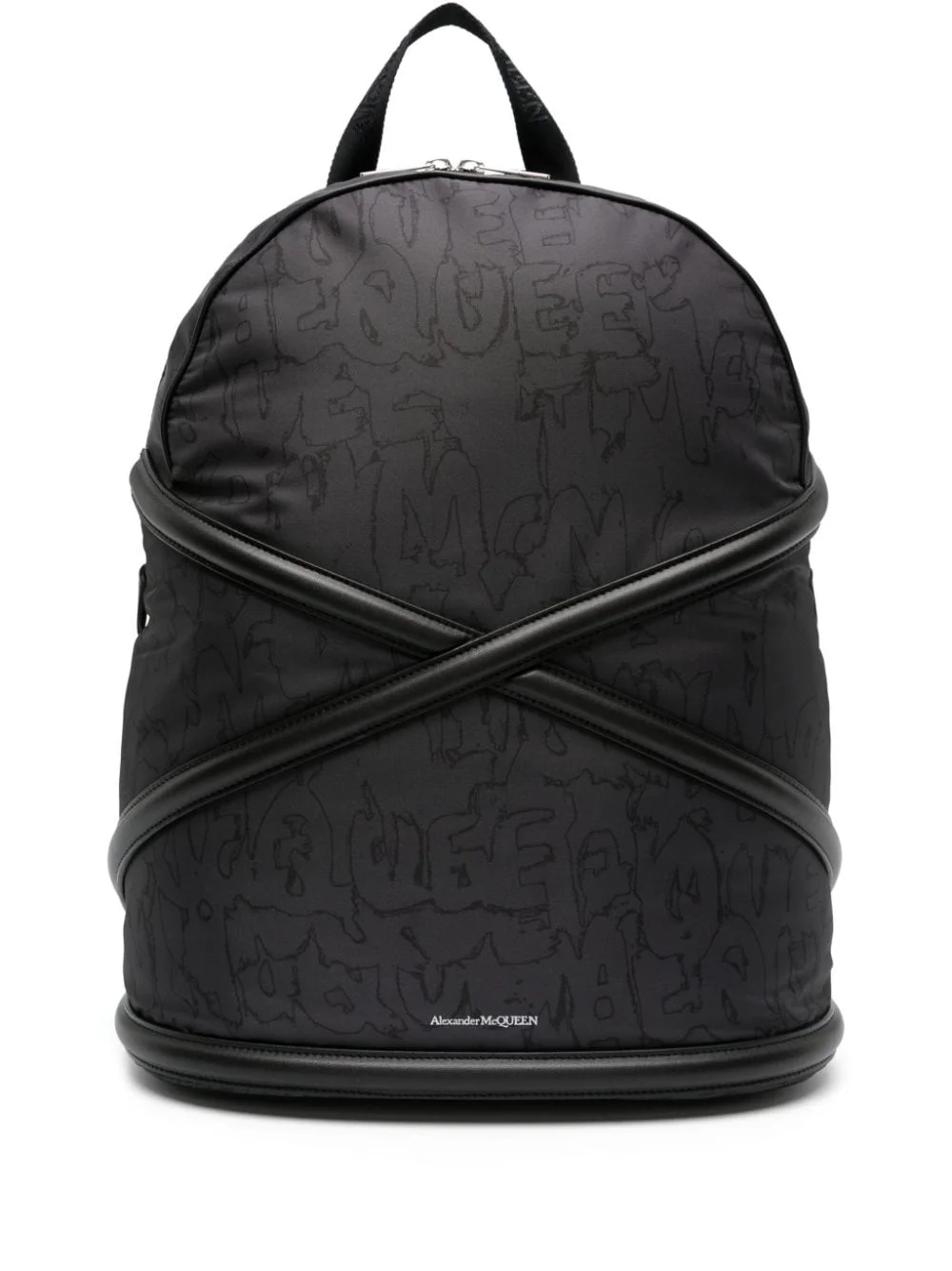 crossover-straps logo-print backpack Adorned with the house's signature harness-detail at the front, this black backpack from Alexander McQueen's SS24 collection is covered in an all-over logo print for a branding-focused finish. Highlights - Black - All-over logo print - Logo stamp to the front - Crossover strap detail - Logo-jacquard straps - All-around zip fastening - Branded zip puller - Single flat top handle - Two adjustable shoulder straps - Flat base - Full lining - Internal logo patch - Internal patch pocket - Internal laptop pocket - Main compartment - Silver-tone hardware - This piece comes complete with a protective dust bag. Made in Italy Composition Outer: Polyester 100% SIZE & FIT Model measurements Height 6 ft 2 in(1.88 m) Bust/Chest 35.03 in(89 cm) Hips 35.82 in(91 cm) Waist 27.95 in(71 cm) Measurement DEPTH 6.69 in(17 cm) HANDLE 2.75 in(7 cm) HEIGHT 15.74 in(40 cm) WIDTH 12.99 in(33 cm)