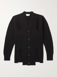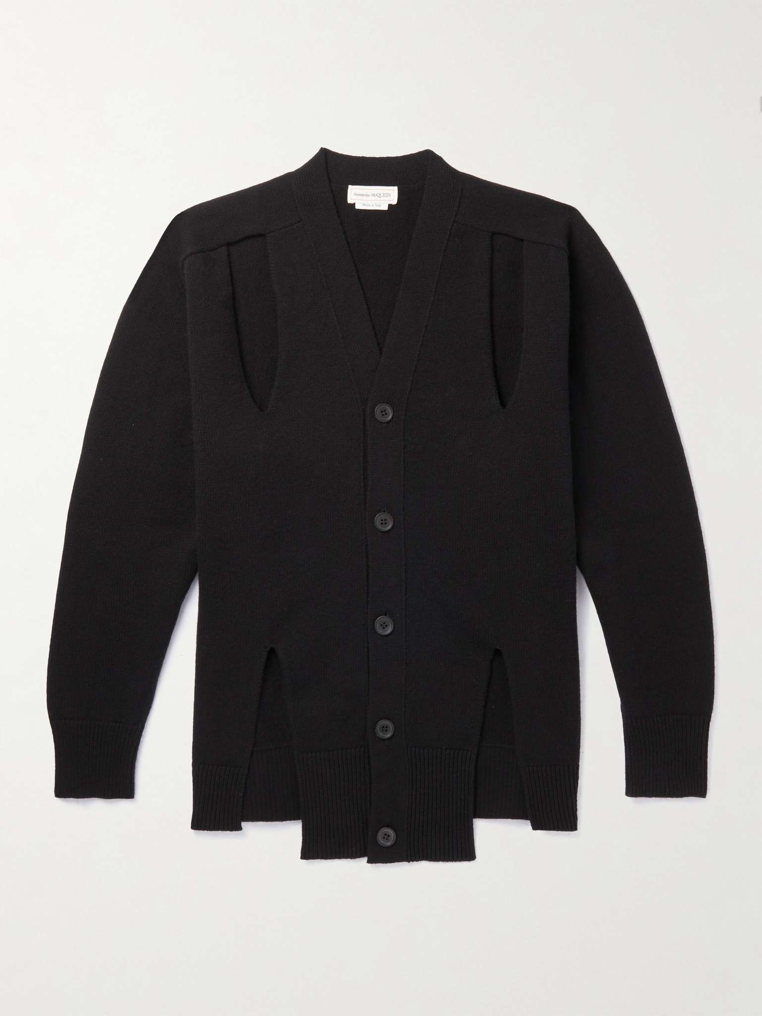 Alexander McQueen's deconstructed cardigan is detailed with cutout sections at the shoulders and hem for a punk-inspired look. Knitted from wool, it has a longline profile and ribbed edges. Layer it over a tailored shirt. Size & Fit - Fits true to size. Take your normal size - Designed for a loose fit - Dropped shoulder seam - Mid-weight knit - Model is shown wearing an IT 46 - Model measures: chest 36"/ 92cm, height 6'2"/ 188cm Details & Care - Black wool - Button fastenings - 100% wool - Dry clean - This item has been imported