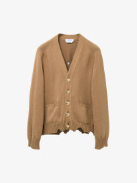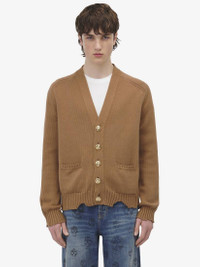 Knitted cardigan. Tan cotton with distressed hem and signature skull detail. Finished with gold tone metal skull buttons. Product details - V-neck - Long sleeves - Gold-finished skull buttons - Product code: 807273Q1BA72757 - Made in Italy - Material: 100% Cotton