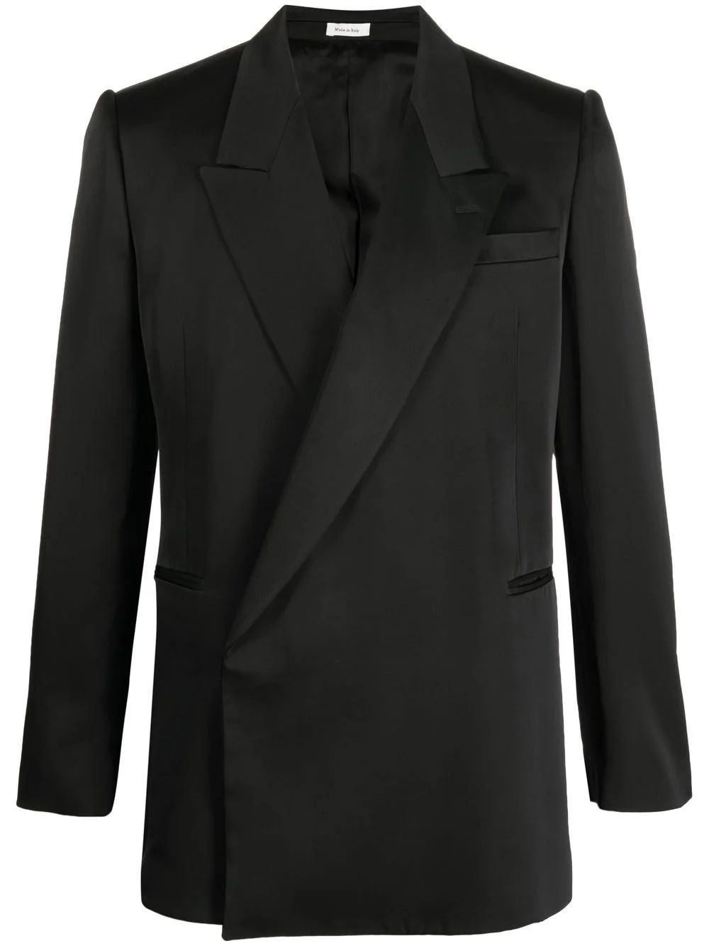 double-breasted blazer black cotton-silk blend double-breasted button fastening notched lapels chest welt pocket two front welt pockets rear slit Made in Italy Composition Lining: Cupro 100%, Cotton 100%, Viscose 100% Outer: Viscose 83%, Silk 17% SIZE & FIT Model measurements Height 6 ft 1 in(1.86 m) Bust/Chest 34.64 in(88 cm) Hips 35.43 in(90 cm) Waist 27.55 in(70 cm) FittingInformation This piece fits true to size. We recommend you get your regular size Cut for a slim fit Made with a mid-weight non-stretch fabric