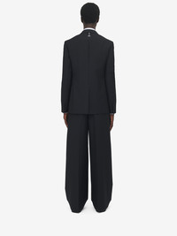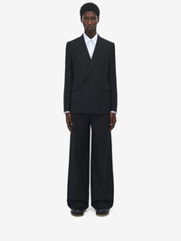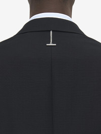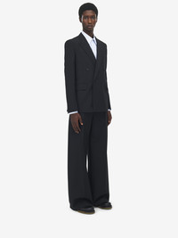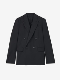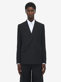 Double-breasted tailored jacket. Black wool mohair. Peak lapels, chest pocket and side flap pockets. Finished with a T-bar chain back detail. Product details - Peak lapels - Side flap pockets - Button fastening - Contains certified wool yarn - Product code: 826353QUAAE1000 - Made in Italy - Material: 75% Wool, 25% Mohair
