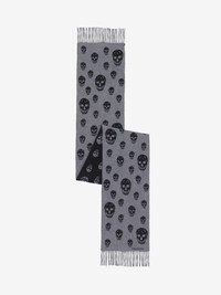 Double-face scarf in graphite and black wool cashmere featuring an all-over skull motif. The scarf is finished with the McQueen logo and fringe detailing. Product details - Dimensions: 38 x 200cm / 15 x 78.7 inches - Product code: 8353794890Q1260 - Made in ITALY - Material: 70% Wool, 30% Cashmere