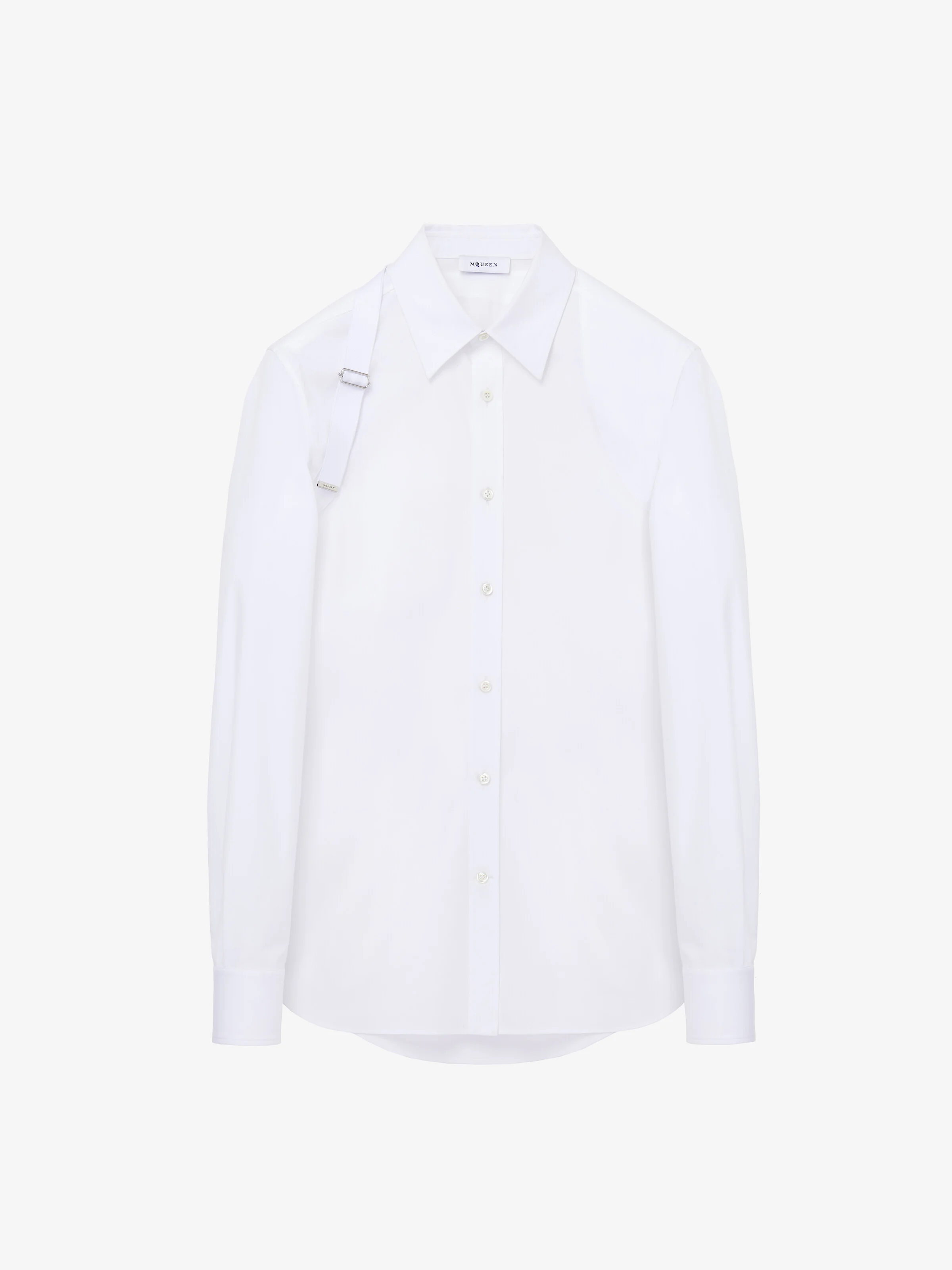 White cotton poplin harness shirt detailed with a metal buckle. Finished with a buttoned front and a double button cuff. Product details - Product code: 828170QNAAB9000 - Made in Italy - Material: 97% Cotton, 3% Elastan
