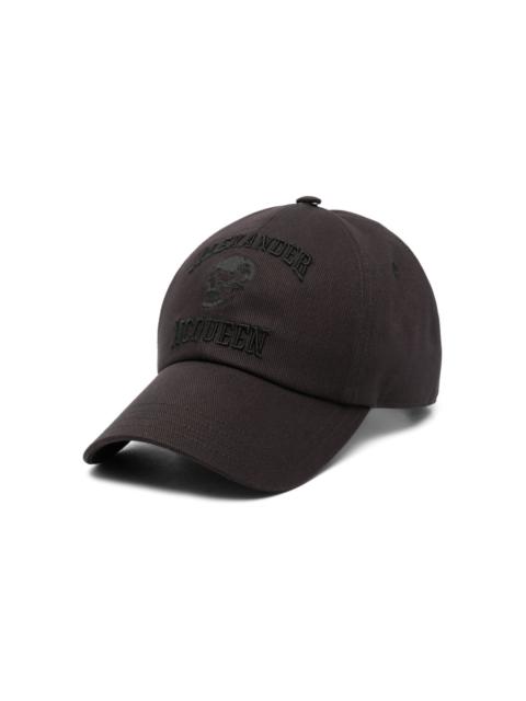 embroidered "Black" cap This baseball cap comes in black and is unmistakably an Alexander McQueen piece thanks to the embroidered logo and skull on the front. It has a curved peak and a strap that can be adjusted at the back. Highlights - Black - Cotton - Embroidered logo to the front - Six-panel construction - Eyelet detailing - Curved peak Made in Italy Composition Lining: Cotton 100% Outer: Cotton 100%, Lamb Skin 100%, Polyester 100% SIZE & FIT Measurement BRIM 2.75 in(7 cm) CIRCUMFERENCE 22.83 in(58 cm)