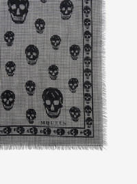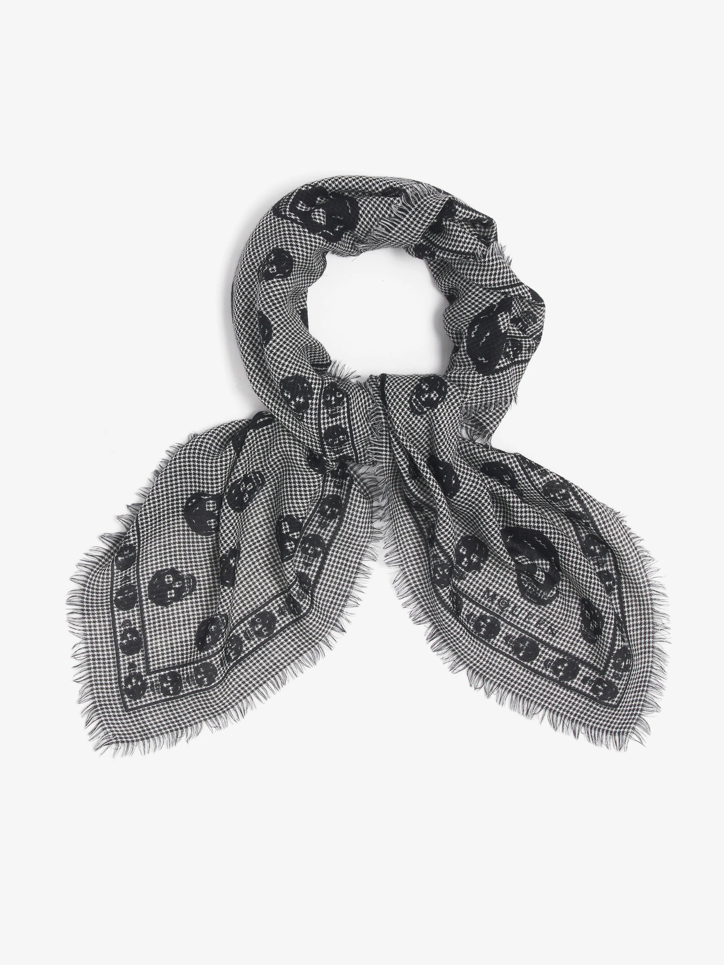 Foulard in a black and ivory houndstooth silk wool jacquard; with a skull overprint. The foulard is detailed with a skull border and the McQueen logo. Finished with frayed edges. Product details - Dimensions: 104 x 120cm / 40.9 x 47.2 inches - Product code: 8147594C50Q1078 - Made in Italy - Material: Wool , Silk