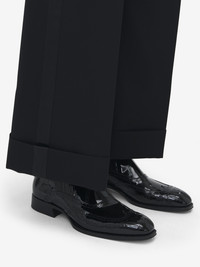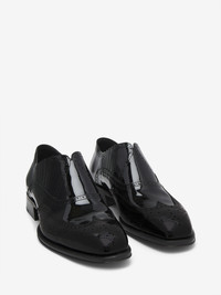 The Jermyn Shoe—polished patent leather slip-on featuring a square-toe silhouette, welt and brogue detailing. Concealed elasticated panels. Finished with a flared heel. Product details - Square toe - Concealed elasticated panels - Leather sole - Heel height: 30 mm / 1.1 inches - Product code: 828673WHAD81000 - Made in Italy - Material: Calf Leather