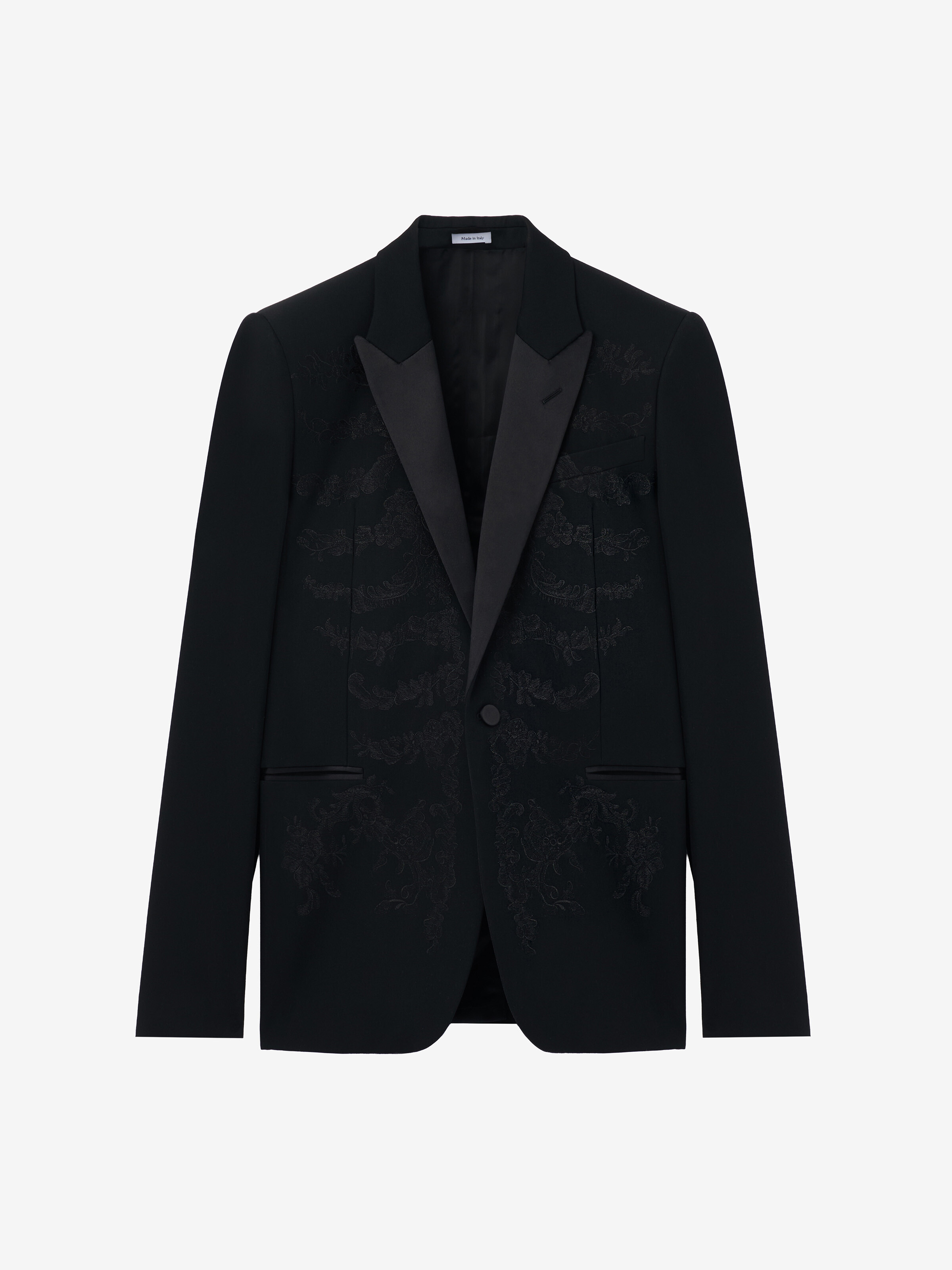 Single-breasted jacket in black wool barathea. Peak lapels and tonal Lace Ribcage embroidery on the front. Finished with a T-Bar chain back detail. Product details - Peak lapels - Side flap pockets - Single button fastening - Product code: 851322QVAAA1000 - Made in ITALY - Material: 100% Wool