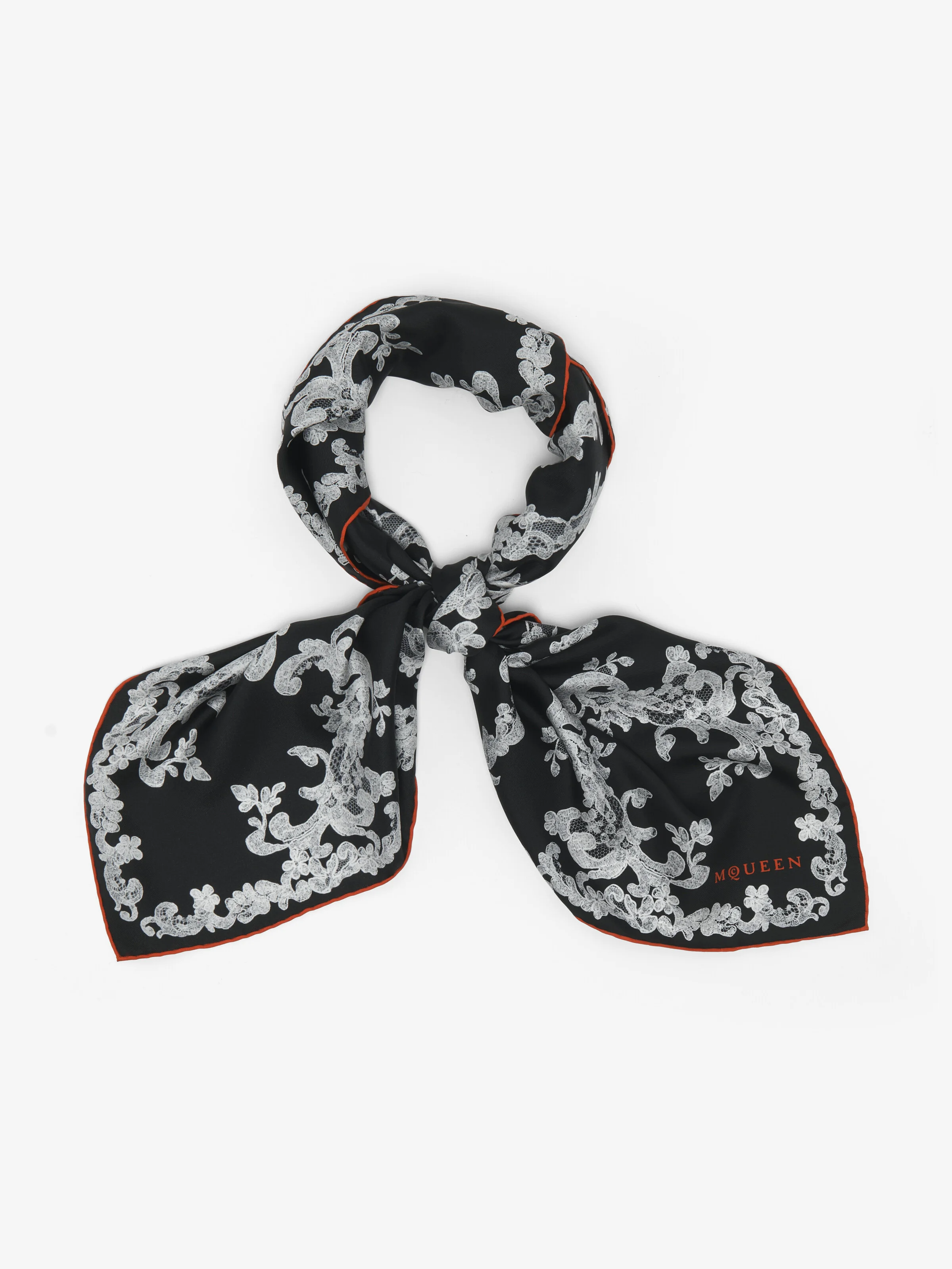 Black and white silk twill foulard featuring a Lace Ribcage print. The foulard is finished with rolled edges and the McQueen logo in the bottom right corner. Product details - Dimensions: 90 x 90cm / 35.4 x 35.4 inches - Product code: 8511603001Q1074 - Made in ITALY - Material: 100% Silk